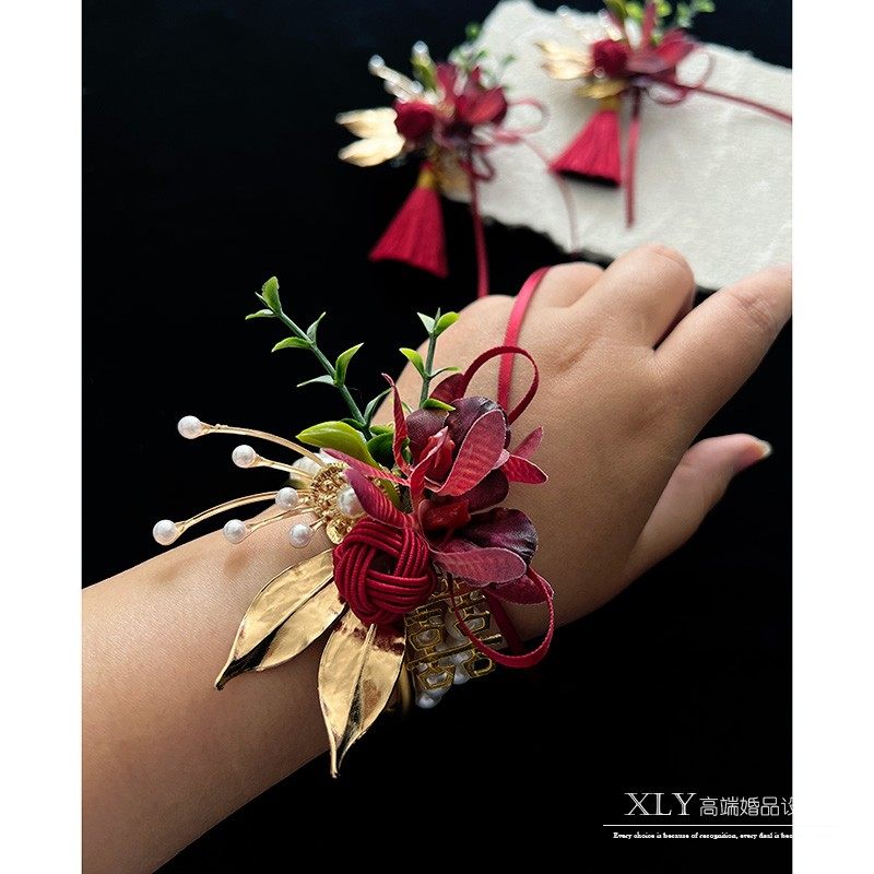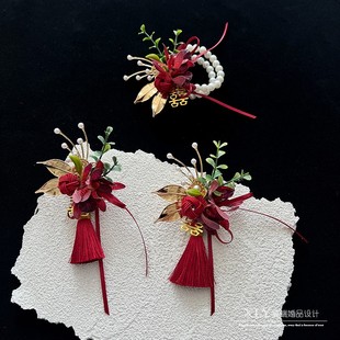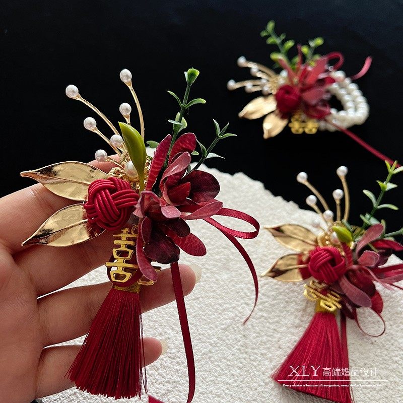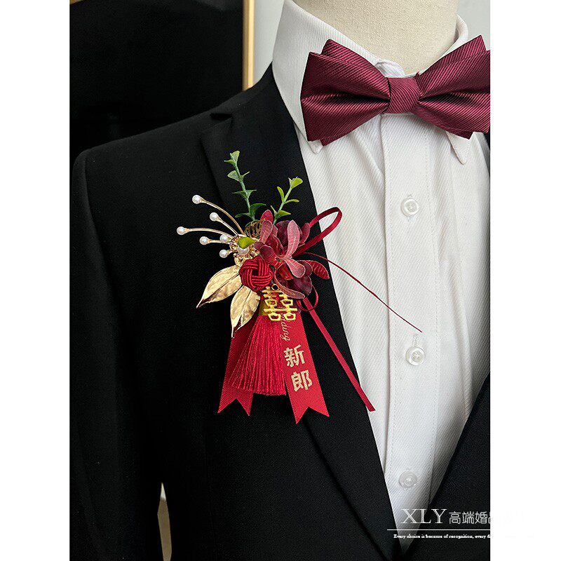 结婚胸花新郎新娘家人用品伴郎伴娘父母胸针婚礼婚庆中式 襟花红色
