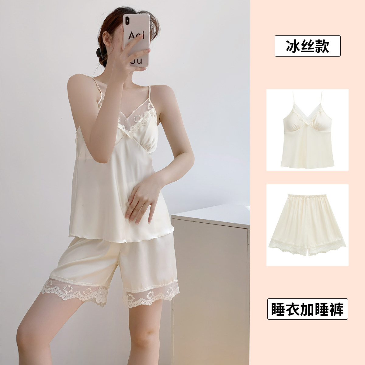两件套装 背心睡衣女夏季 仿真丝吊带短裤 夏款 薄冰丝性感家居服套装