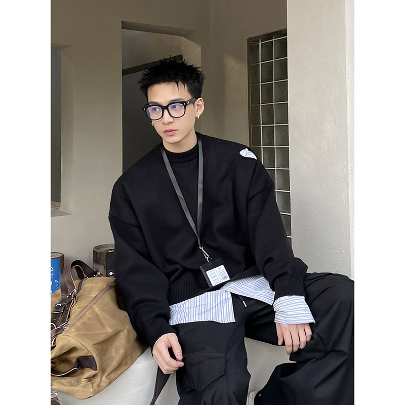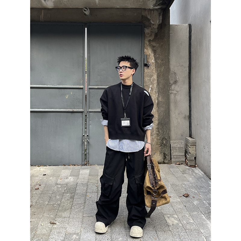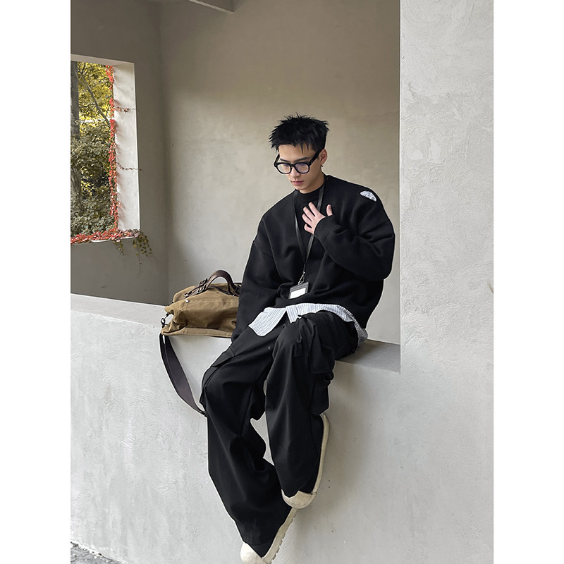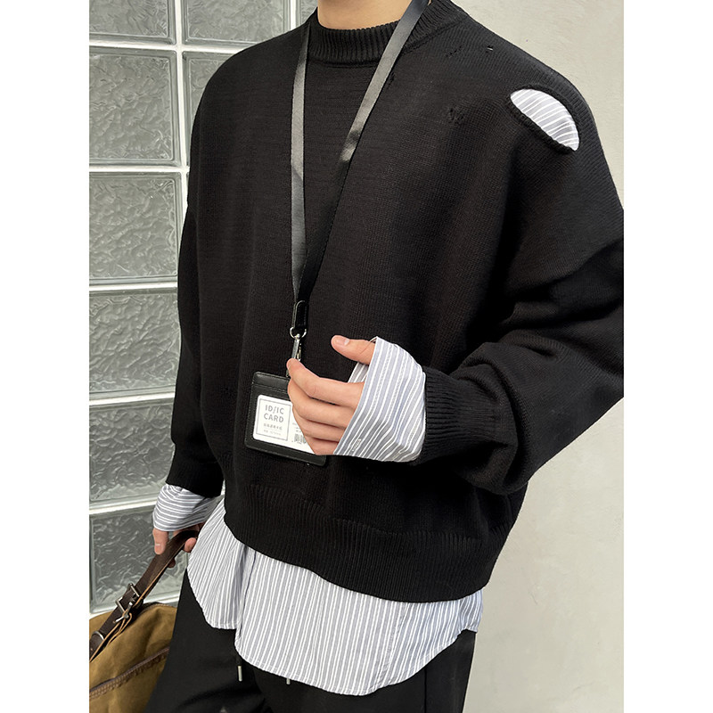 圆领男生宽松针织衫 PLTH 小众设计师款 慵懒破洞短款 韩系毛衣 冬季