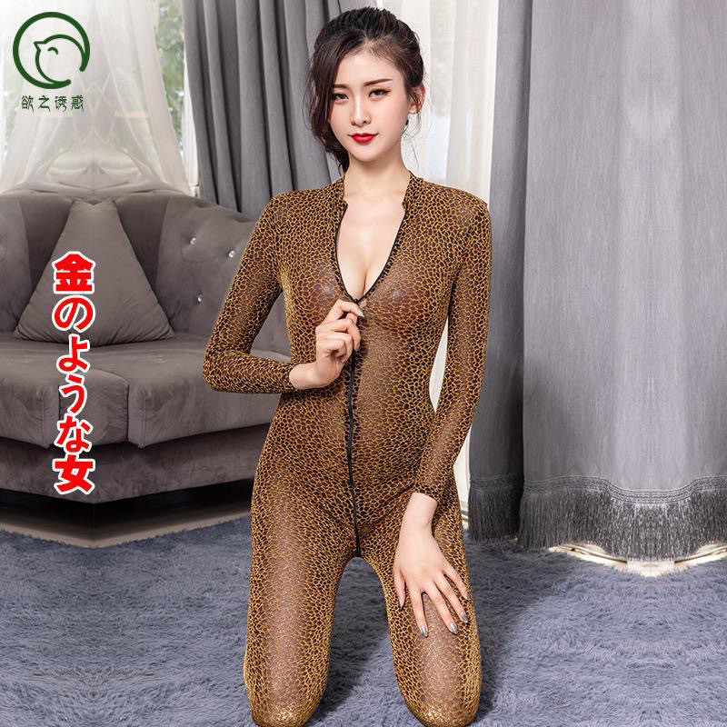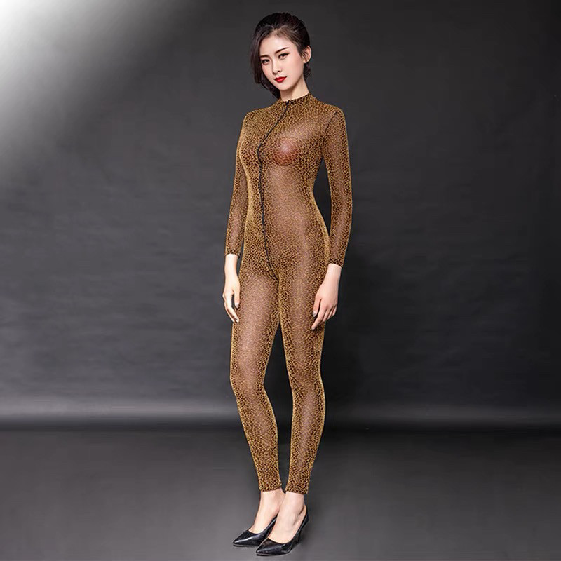 网红主播性感豹纹印花长袖 拉链紧身显瘦漆皮塑身连体泳衣