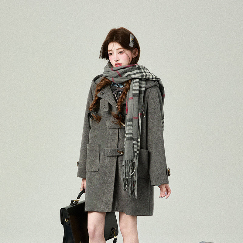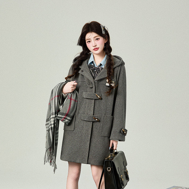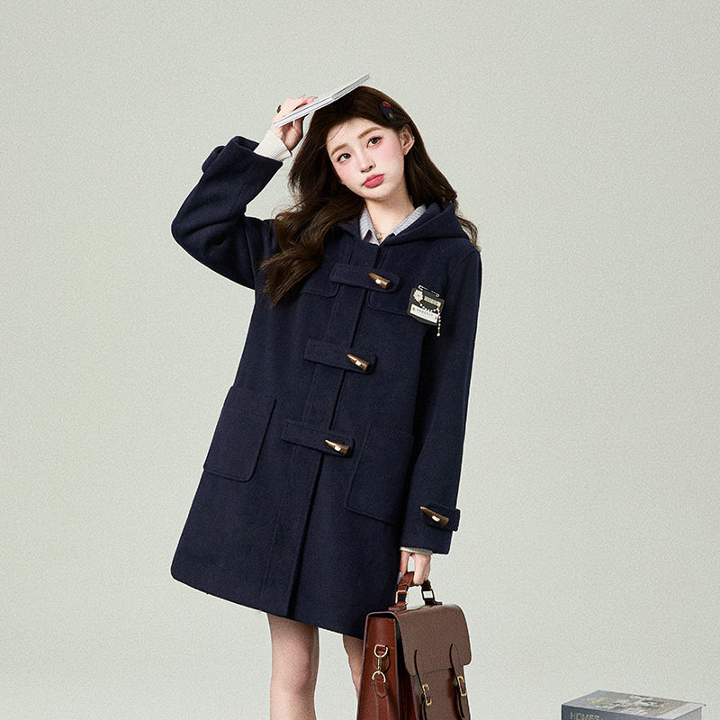 花铃太太秋冬新款 牛角扣夹棉大衣毛呢子韩系女jk校供感学院风 长款