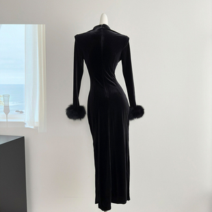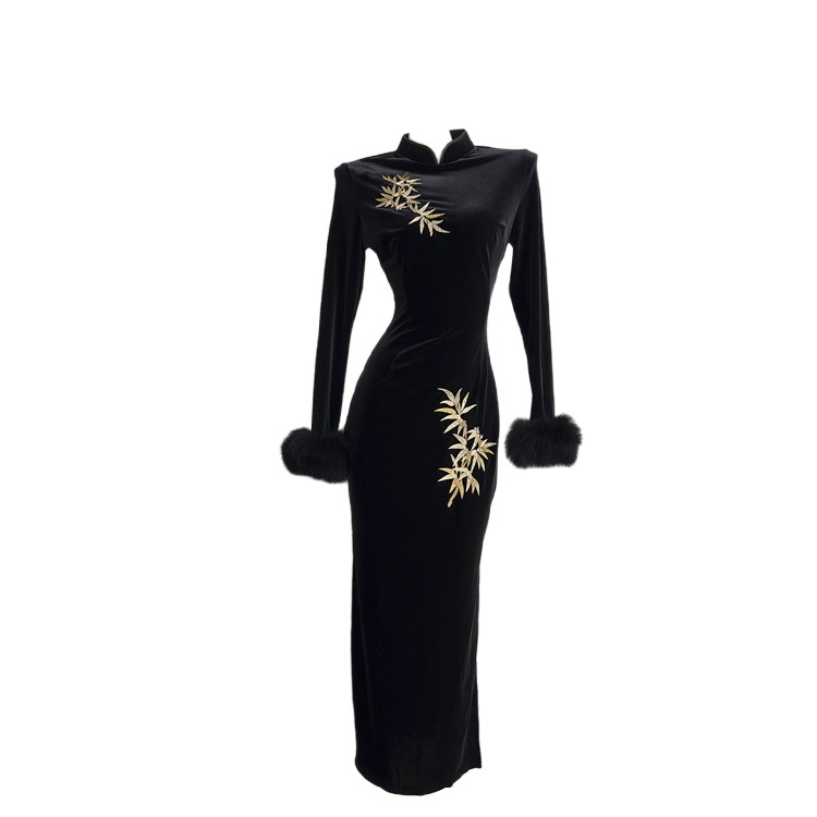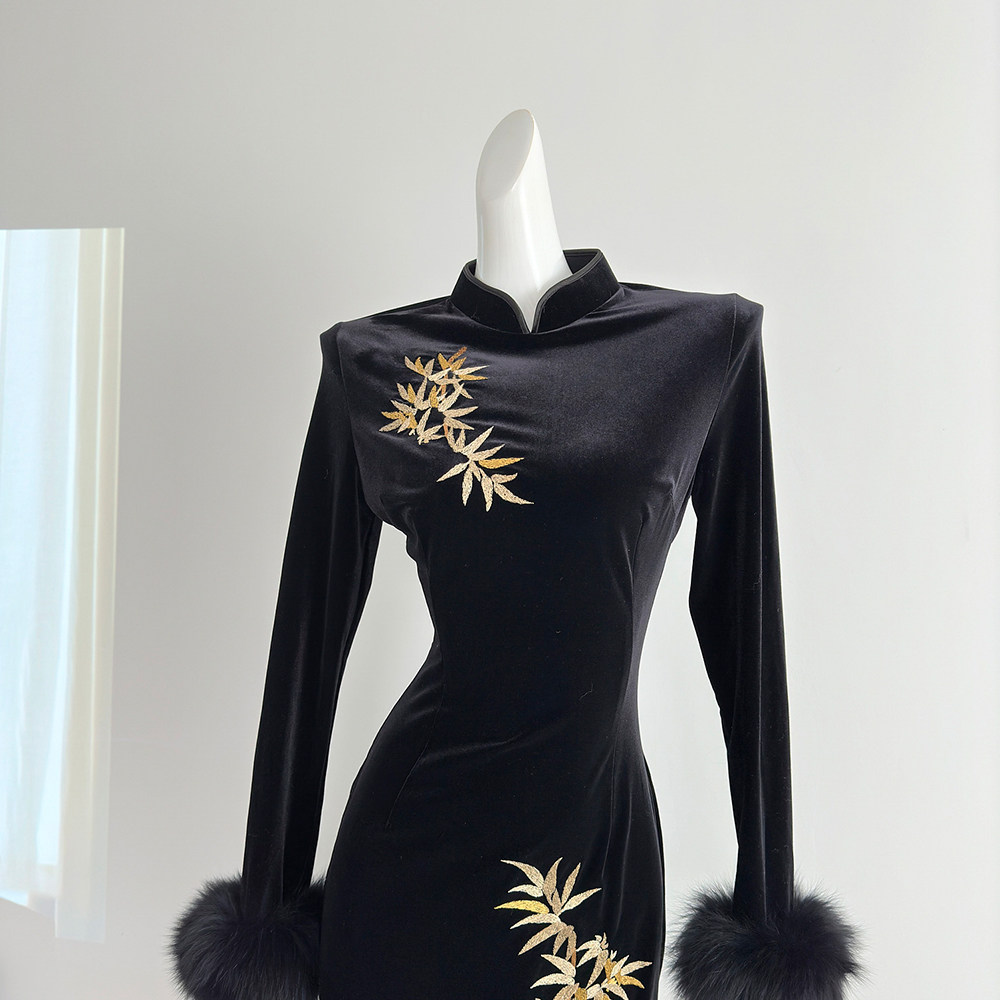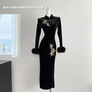 金竹 仿狐狸毛黑色丝绒旗袍长袖 LIULIUGE新中式 国风高级定刺绣厚款