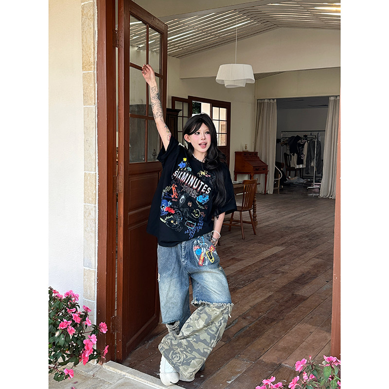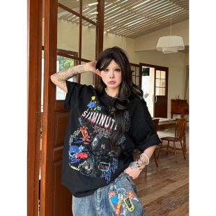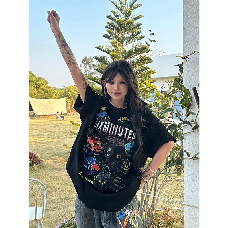 棉t 情侣款 Sixminmu小蚊子美式 潮牌纯棉彩绘T恤女宽松圆领涂鸦短袖