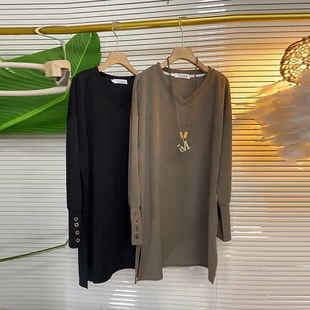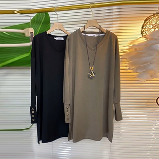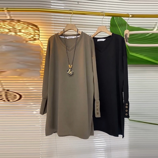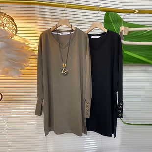 T恤衫 加肥大码 遮肚子V领长袖 休闲百搭宽松简约上衣胖妹妹韩版 女装