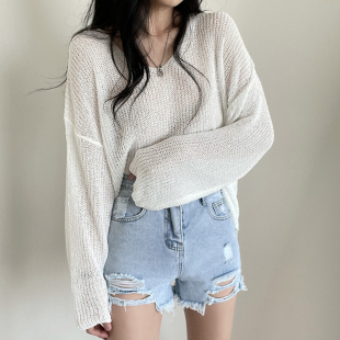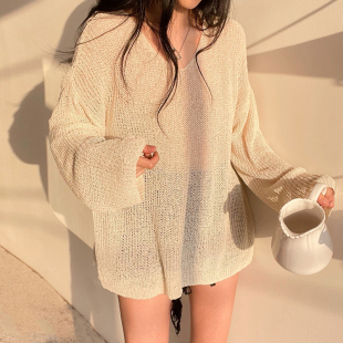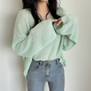 宽松防晒罩衫 小众慵懒风蓝色针织衫 薄款 设计感小众镂空长袖 女夏季