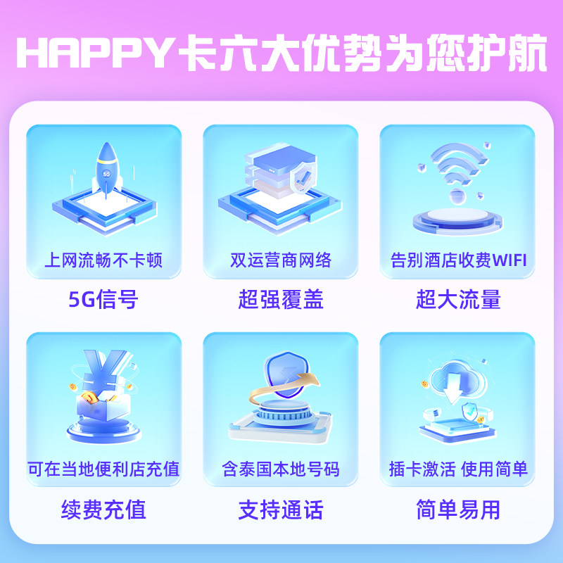 30天可选无限5G流量旅游手机上网SIM卡 泰国电话卡Happy卡7