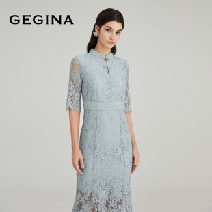 旗袍修身 镂空绣花新中式 GEGINA吉吉娜夏新品 鱼尾裙连衣裙 蕾丝
