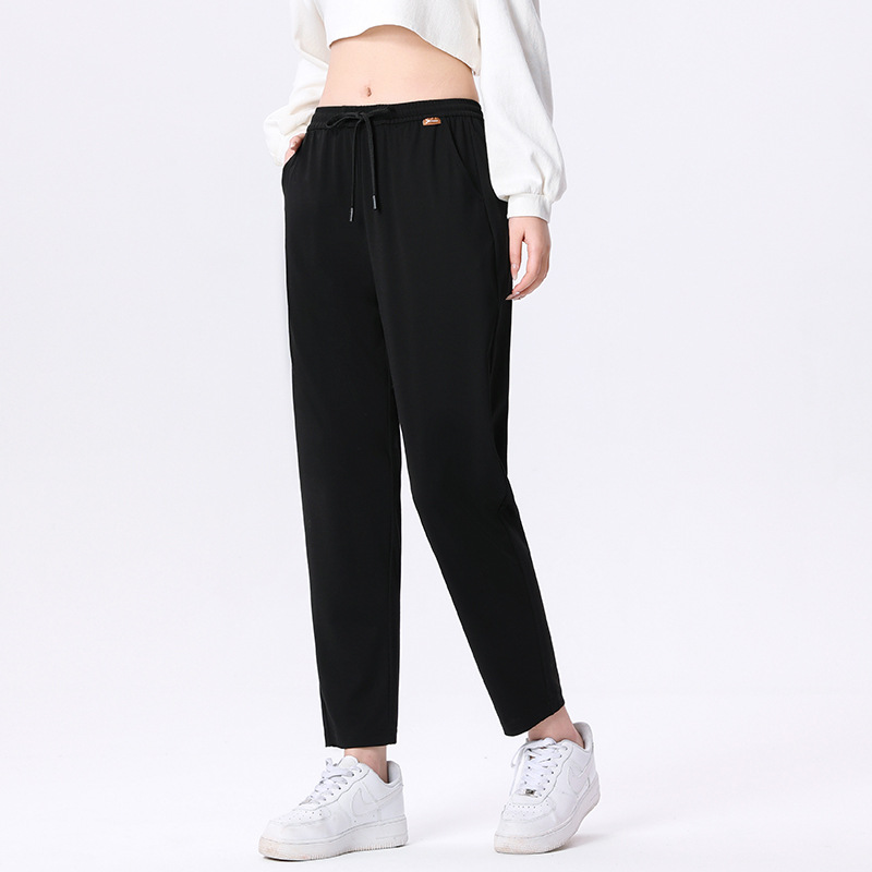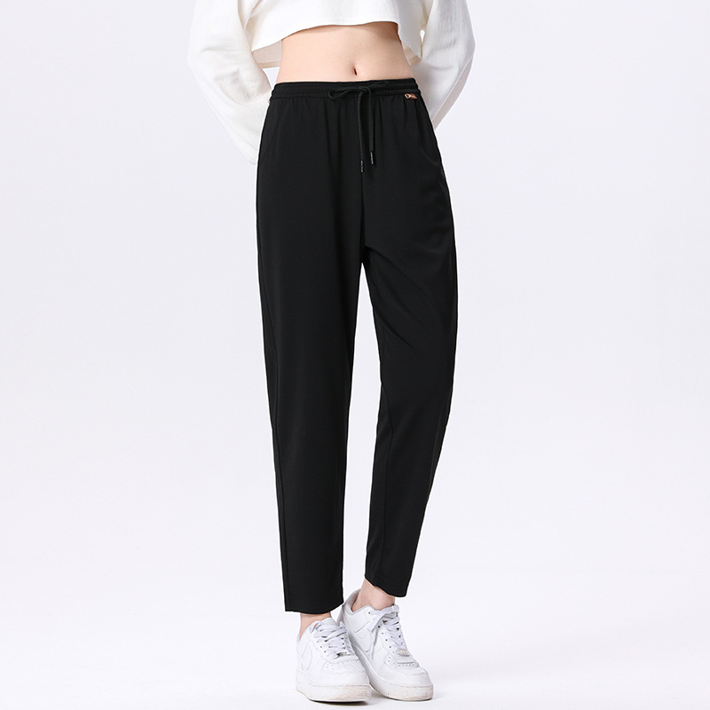 弹力蚕丝长裤 女2025春夏黑色系带中腰休闲裤 子外穿萝卜裤 凯蒂芬裤