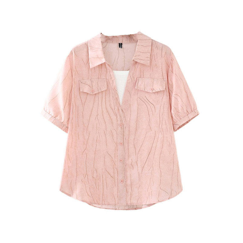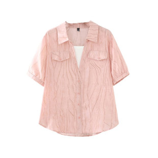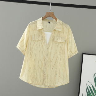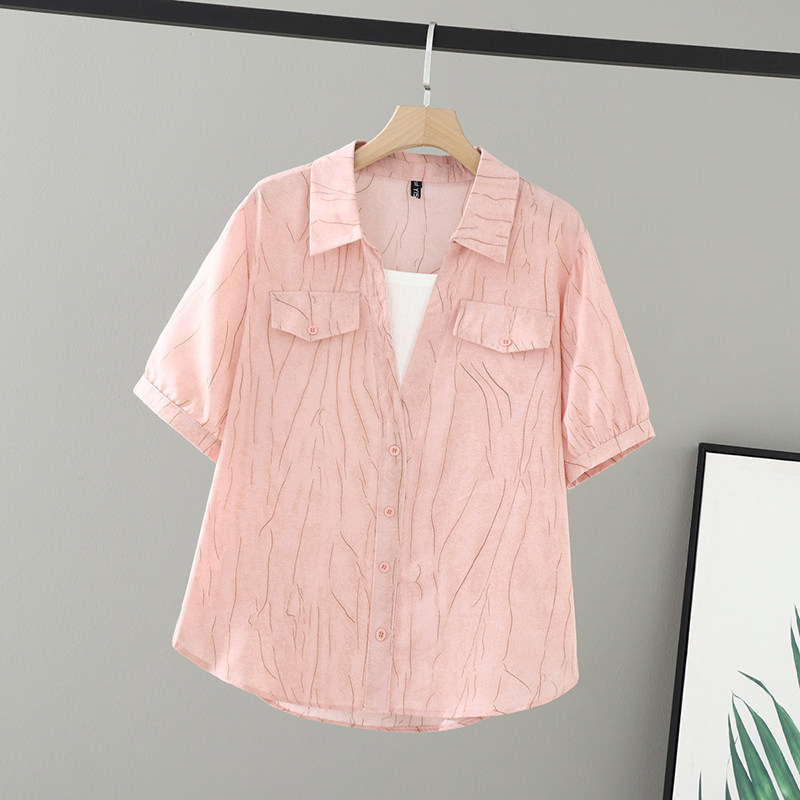 上衣200斤假两件双口袋印线条花衬衫 大码 新款 胖妹妹夏装 女 女装