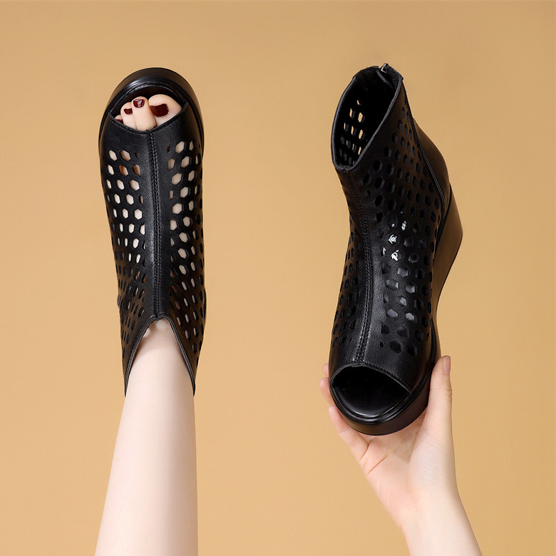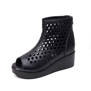 女厚底防滑鱼嘴鞋 夏季 女镂空透气罗马鞋 女外穿真皮坡跟洞洞鞋 凉鞋