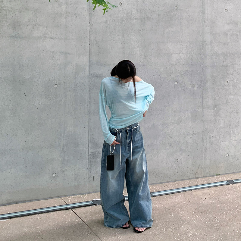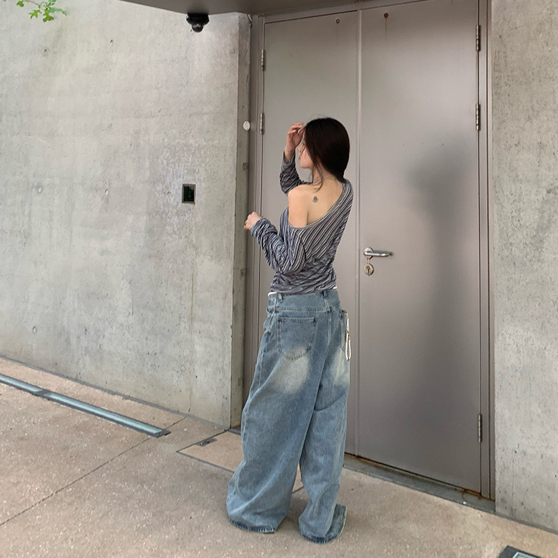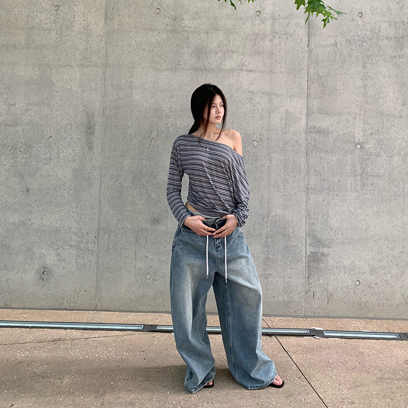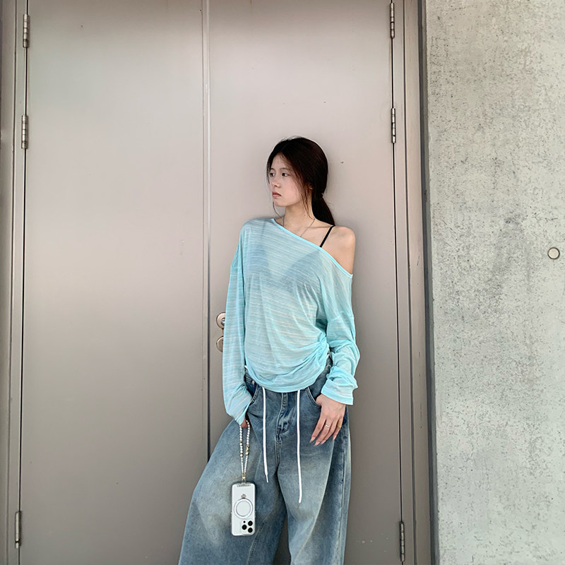T恤罩衫 冰凉斜肩条纹防晒显瘦长袖 女宽松百搭高级感上衣 夏季 E7Q8