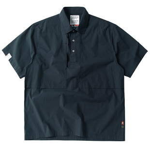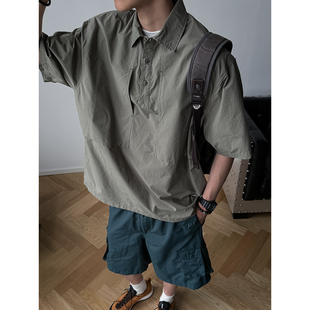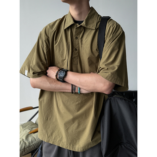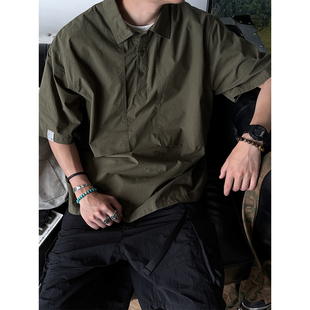 新款 男夏季 宽松纯棉百搭翻领衬衣有领T恤潮 衬衫 日系潮牌水洗工装