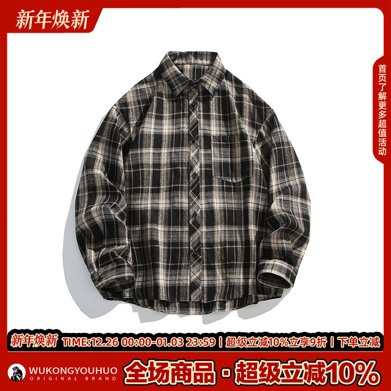 男女春秋街头宽松情侣休闲衬衣 衬衫 悟空有货潮牌复古美式 格纹长袖