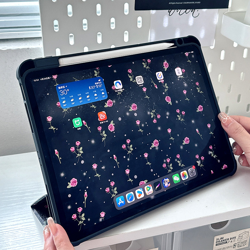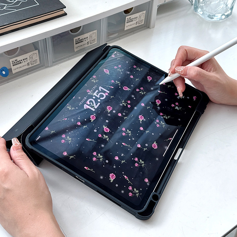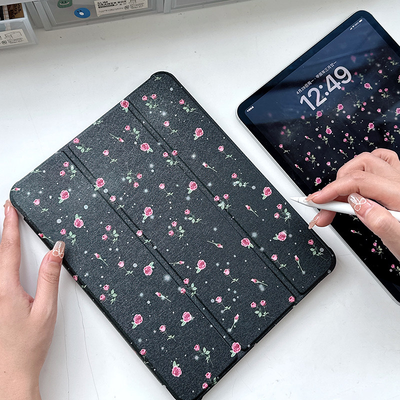 ipad亚克力保护壳黑色玫瑰ipadair5保护套三折透明10.2适用苹果9代十可爱720旋转平板matepad11小米荣耀pro11