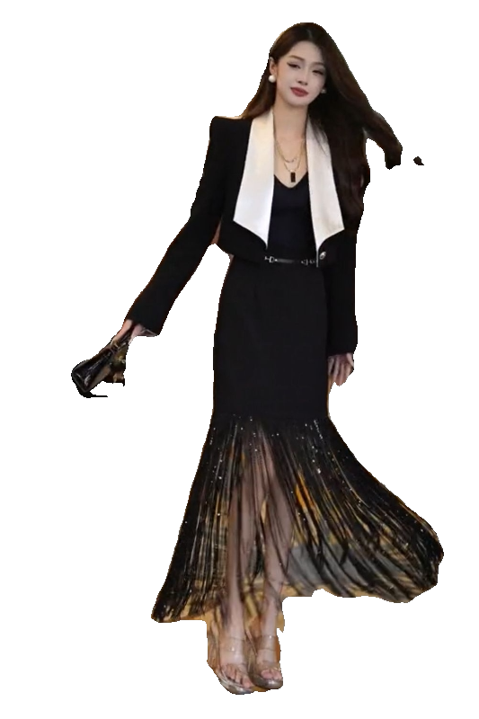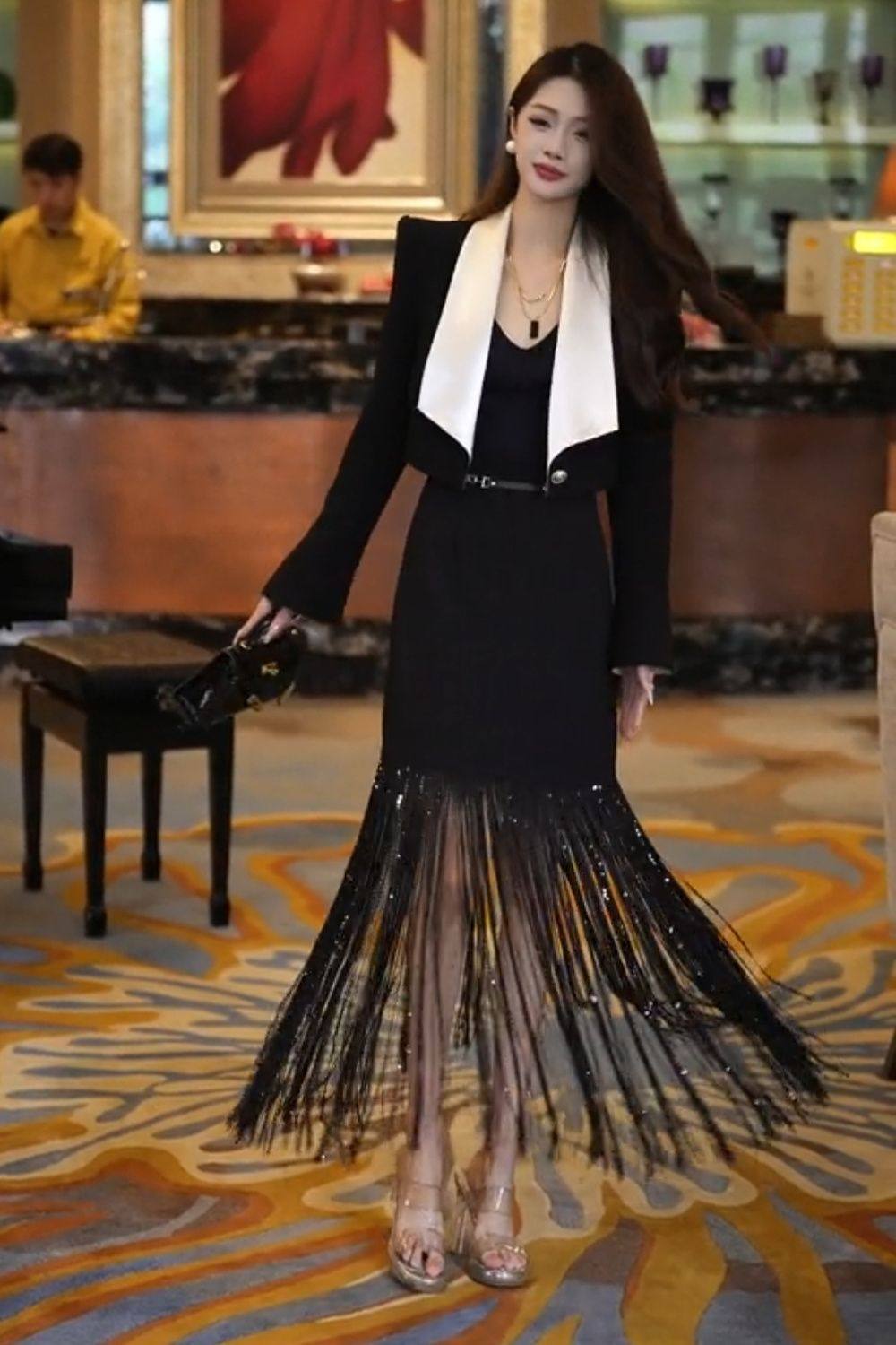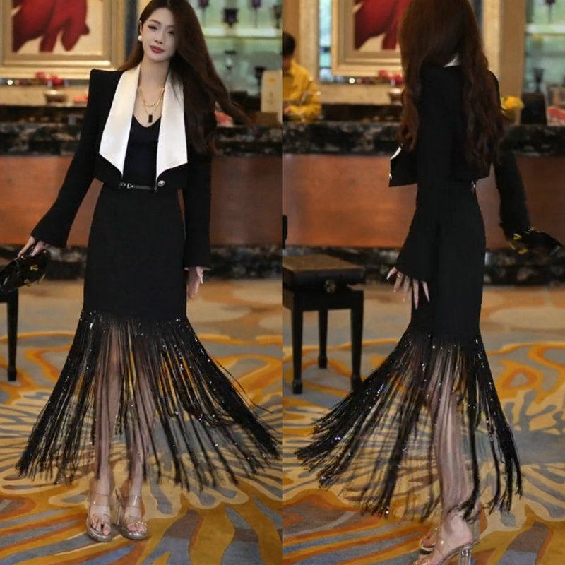 两件套晚礼服潮 小个子西装 春夏高级女神时尚 百搭流苏裙子高级短款