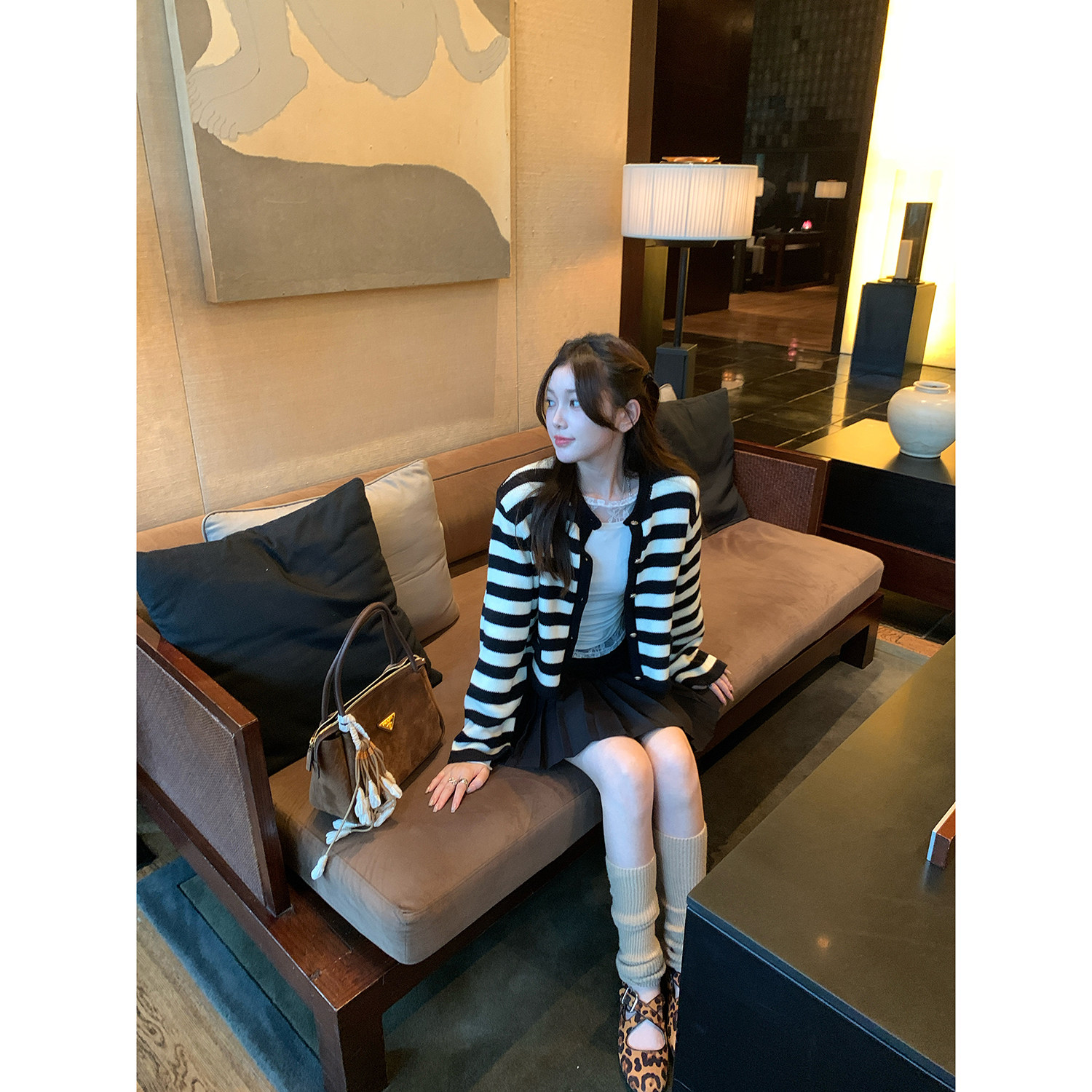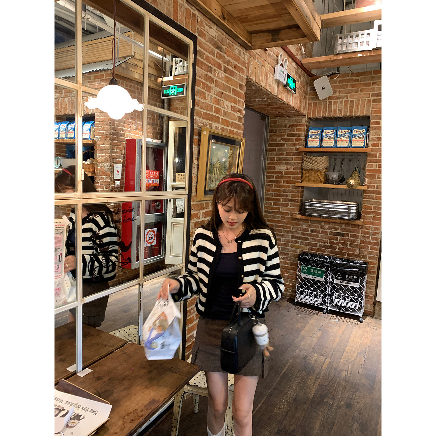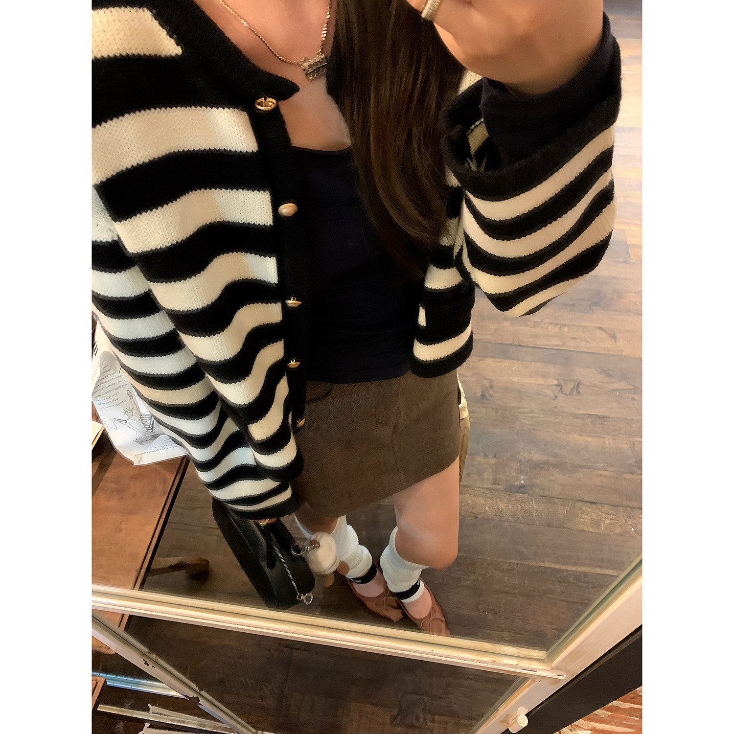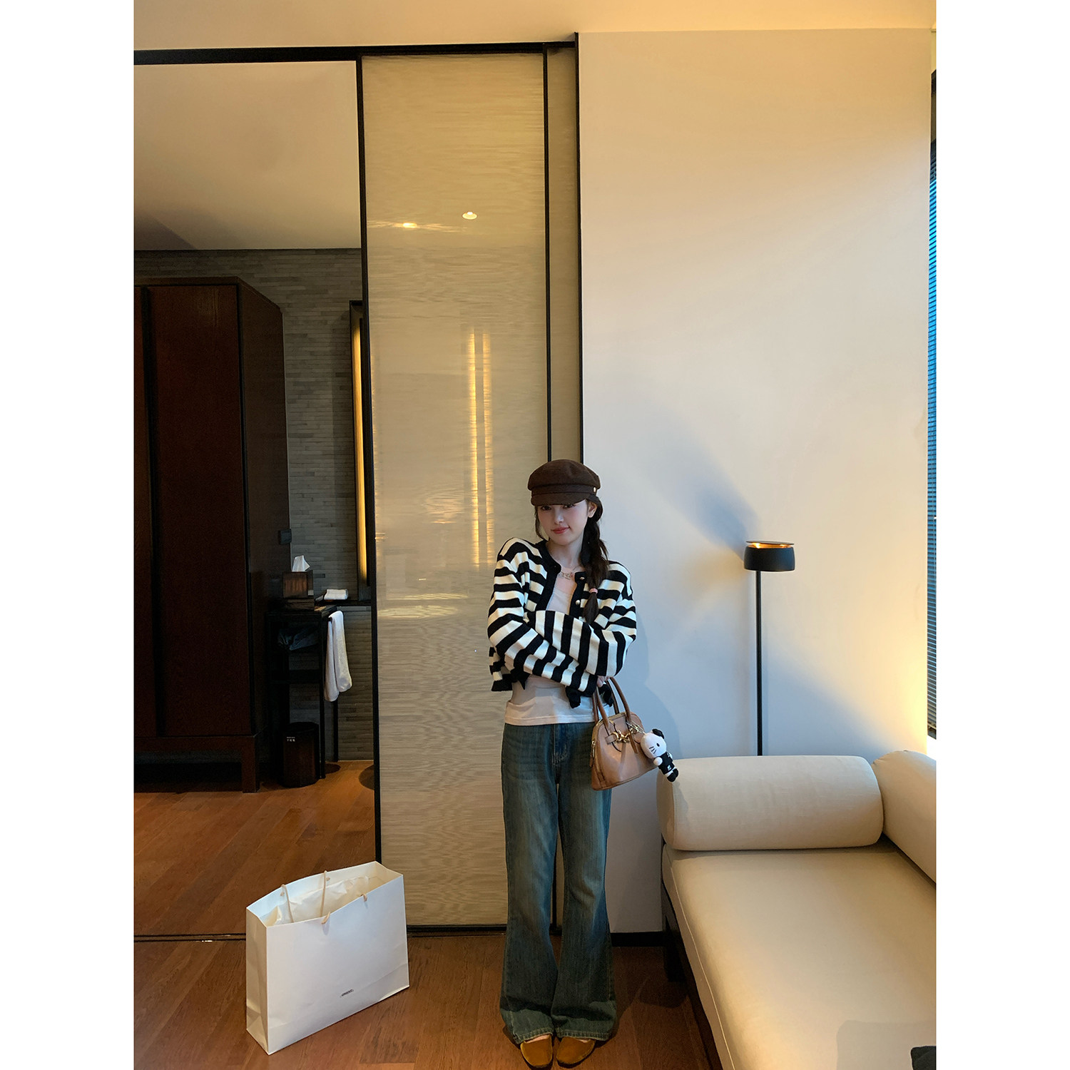 新款 女2024秋季 气质宽松圆领毛衣外套 黑白条纹羊毛针织开衫 AHY