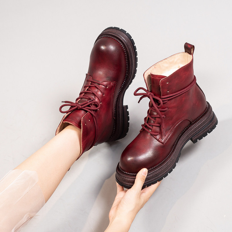 真皮 管短靴复古骑士马丁靴 内增高西部牛仔堆堆靴女2025秋褶皱裤