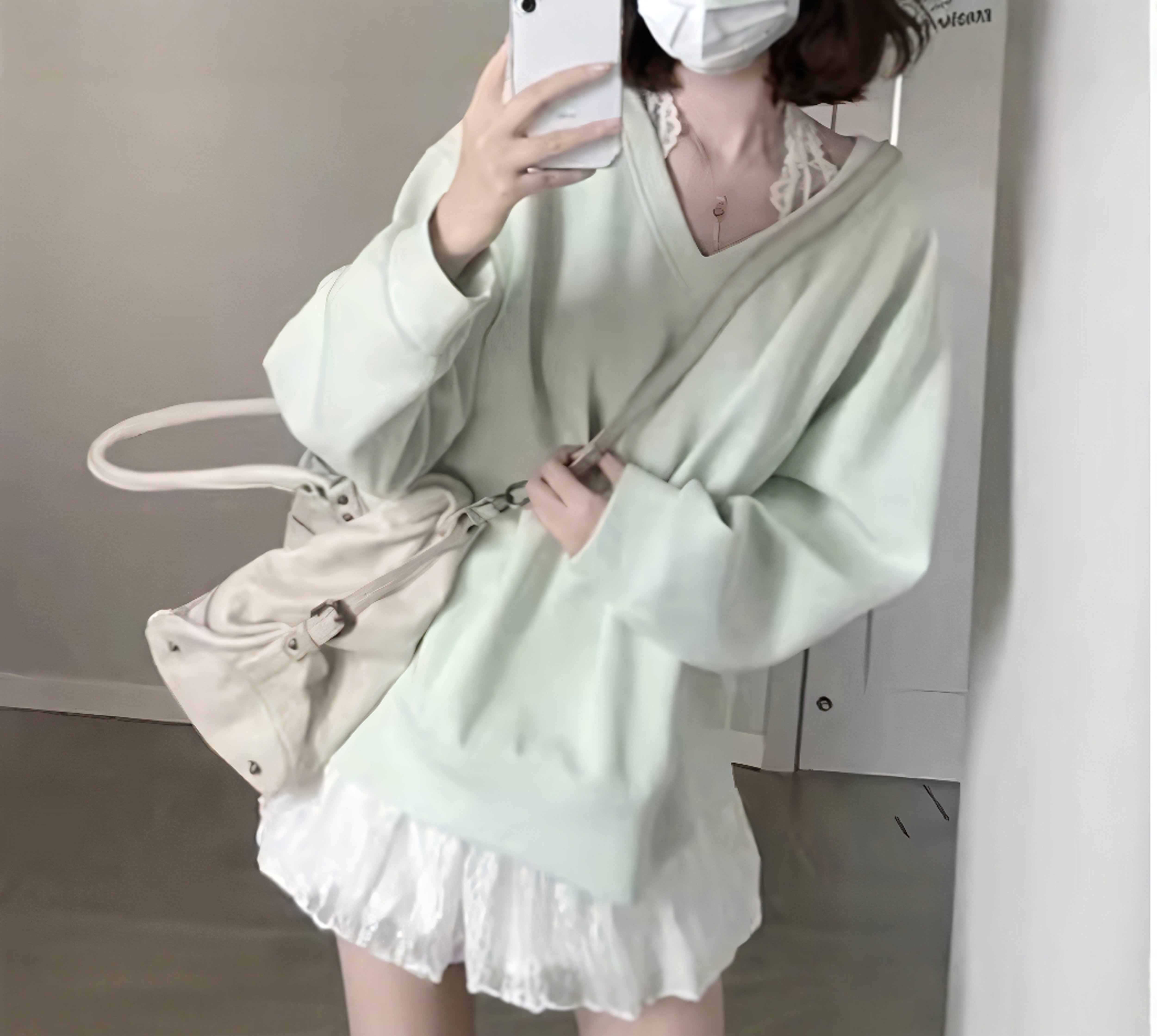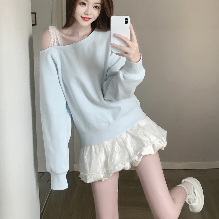 套头心机露肩上衣 假两件斜肩卫衣女春季 慵懒假期