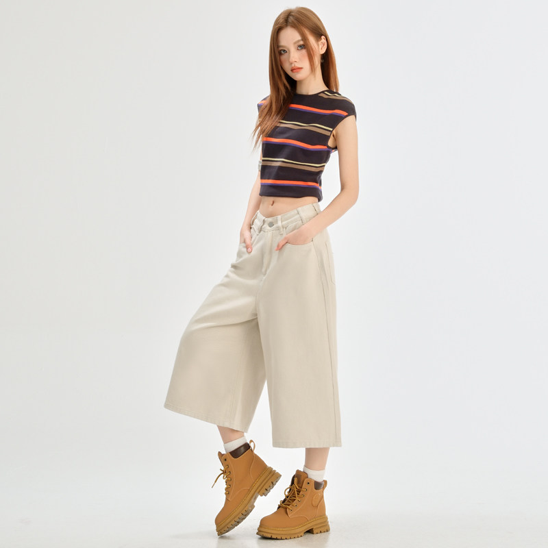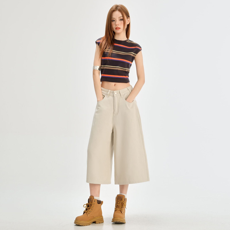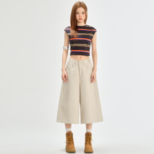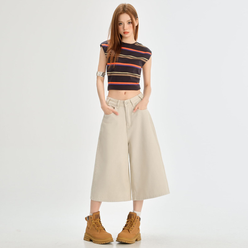 女宽松显瘦直筒中裤 奶咖色阔腿七分牛仔短裤 子 美式 2025年春夏新款