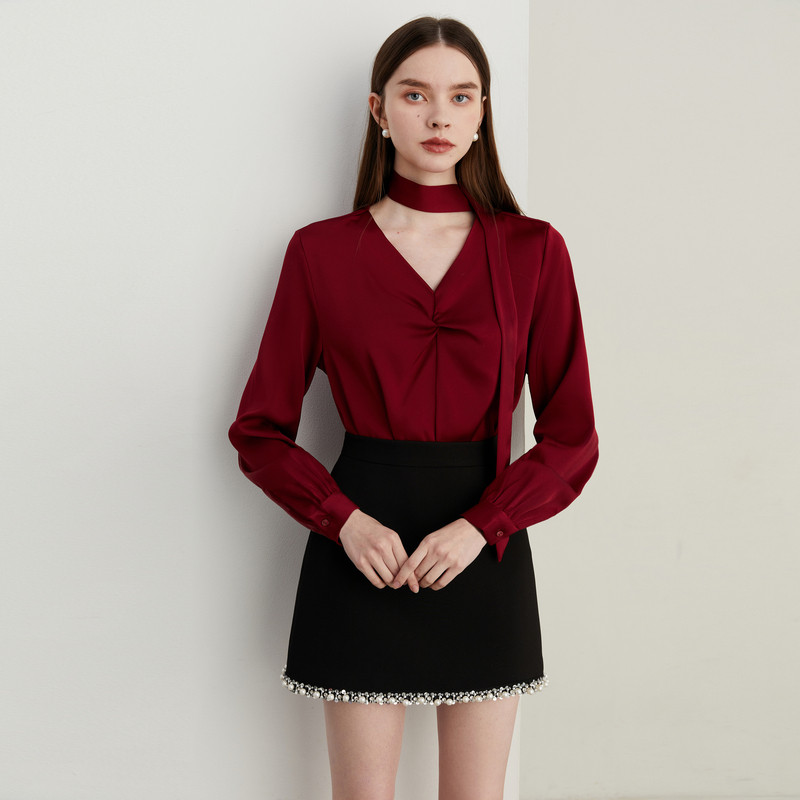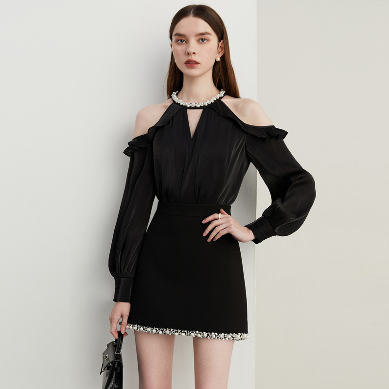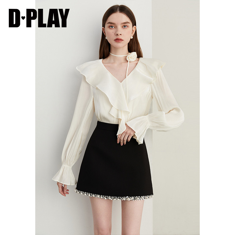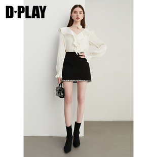 DPLAY2025年秋季 半身裙女小黑裙 气质休闲高腰珍珠黑色短裙短款