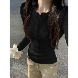 辣妹修身 打底衫 显瘦上衣服 T恤女春秋内搭短款 设计感小众纽扣长袖