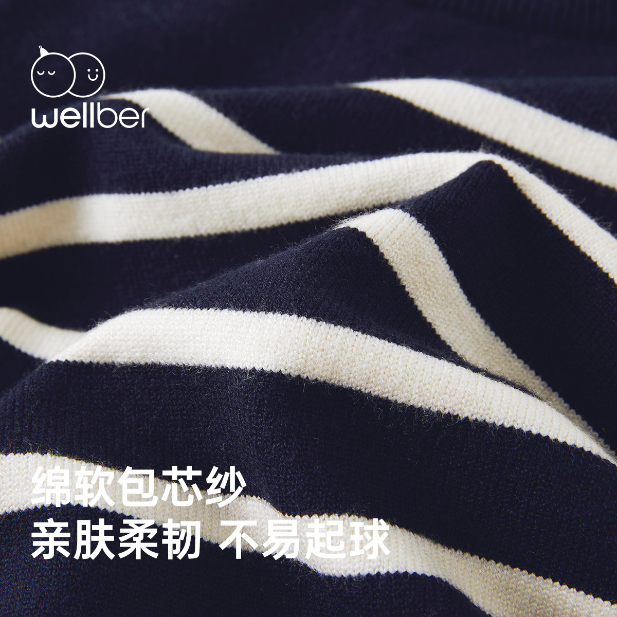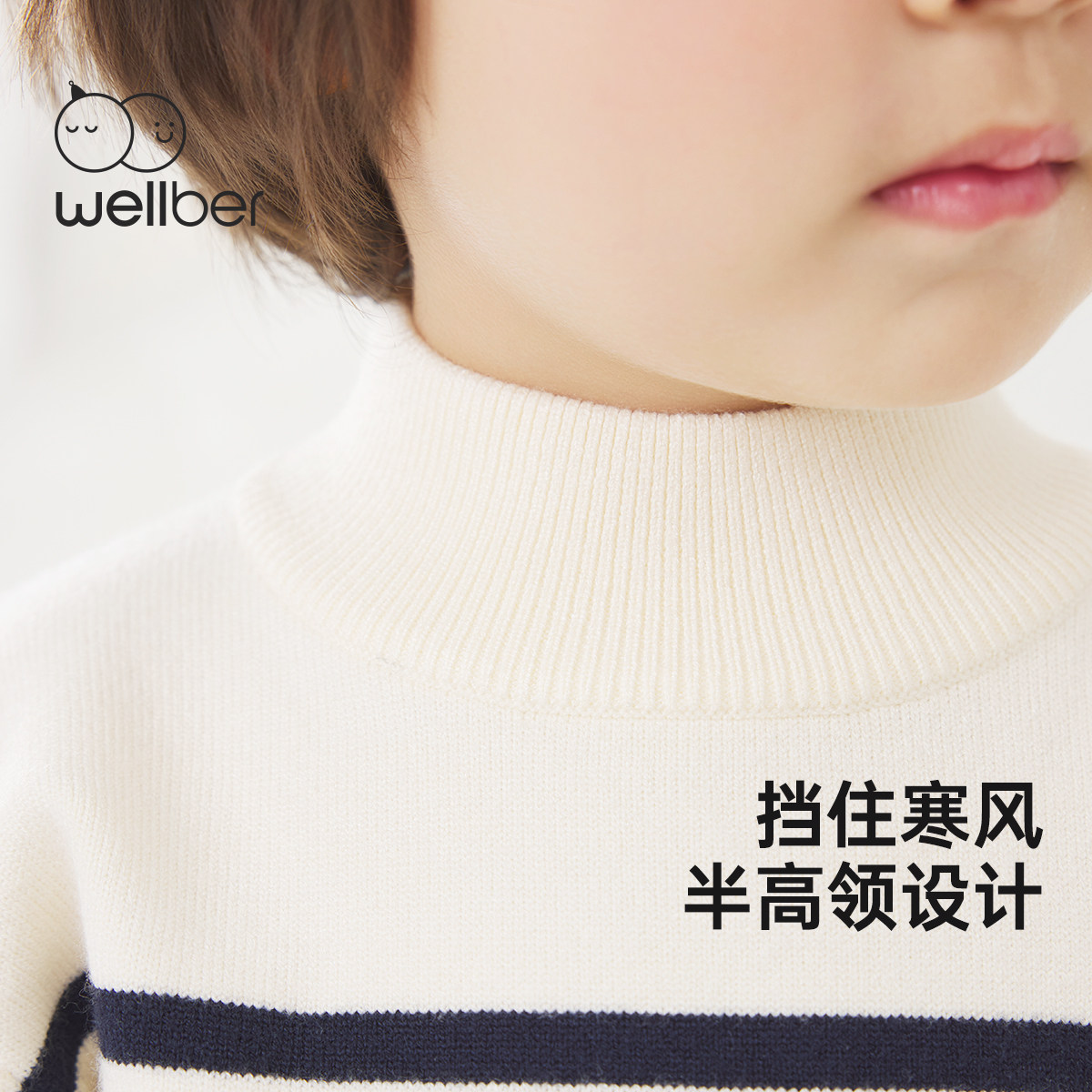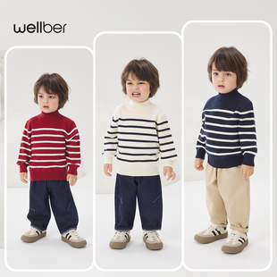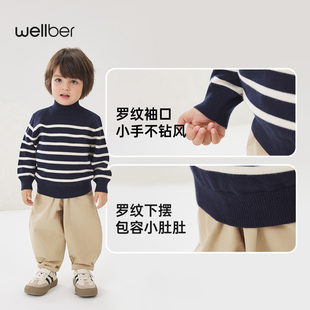 威尔贝鲁男童毛衣加厚冬款 圆领条纹半高领宝宝上衣儿童加厚打底衫