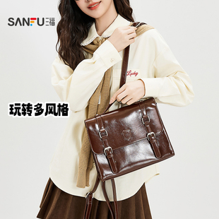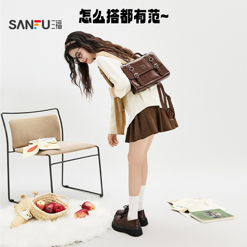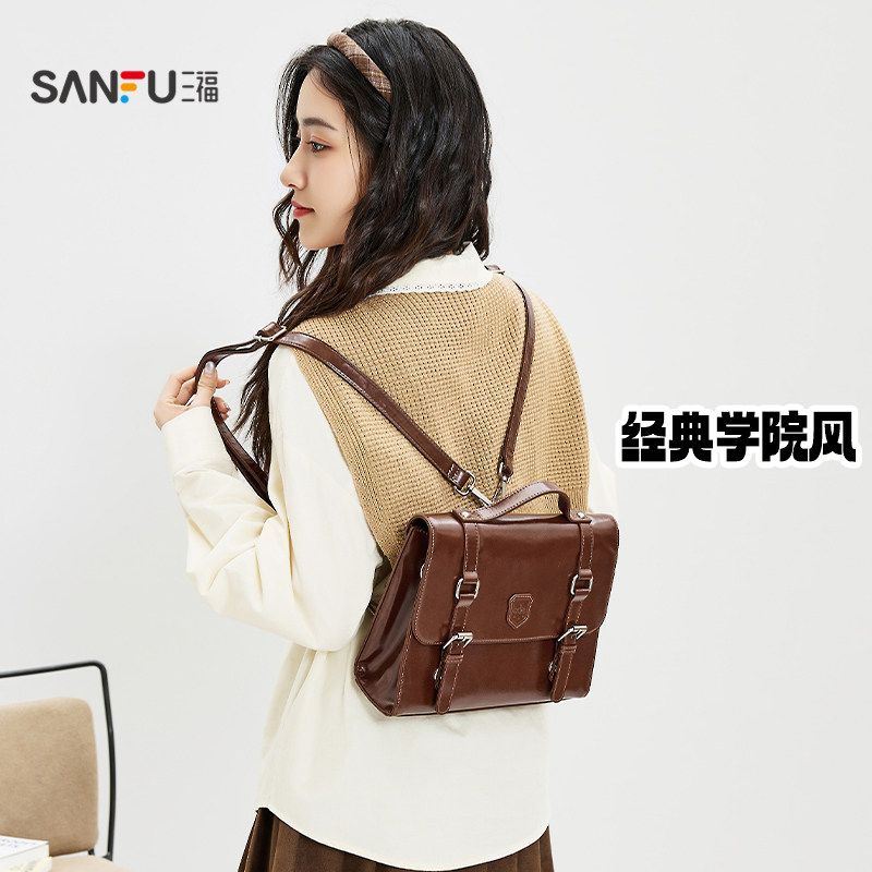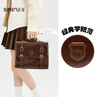 三福手提包秋季 复古学院风剑桥包简约纯色翻盖型女包508711