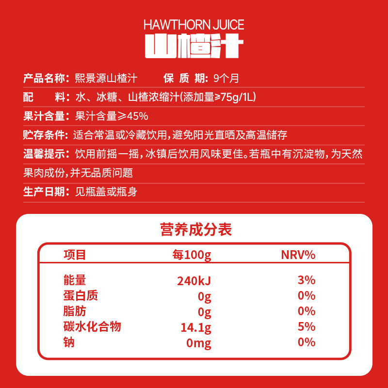 熙景源山楂汁草本果汁饮料200ml 10瓶酸甜可口解腻儿童送礼无添加