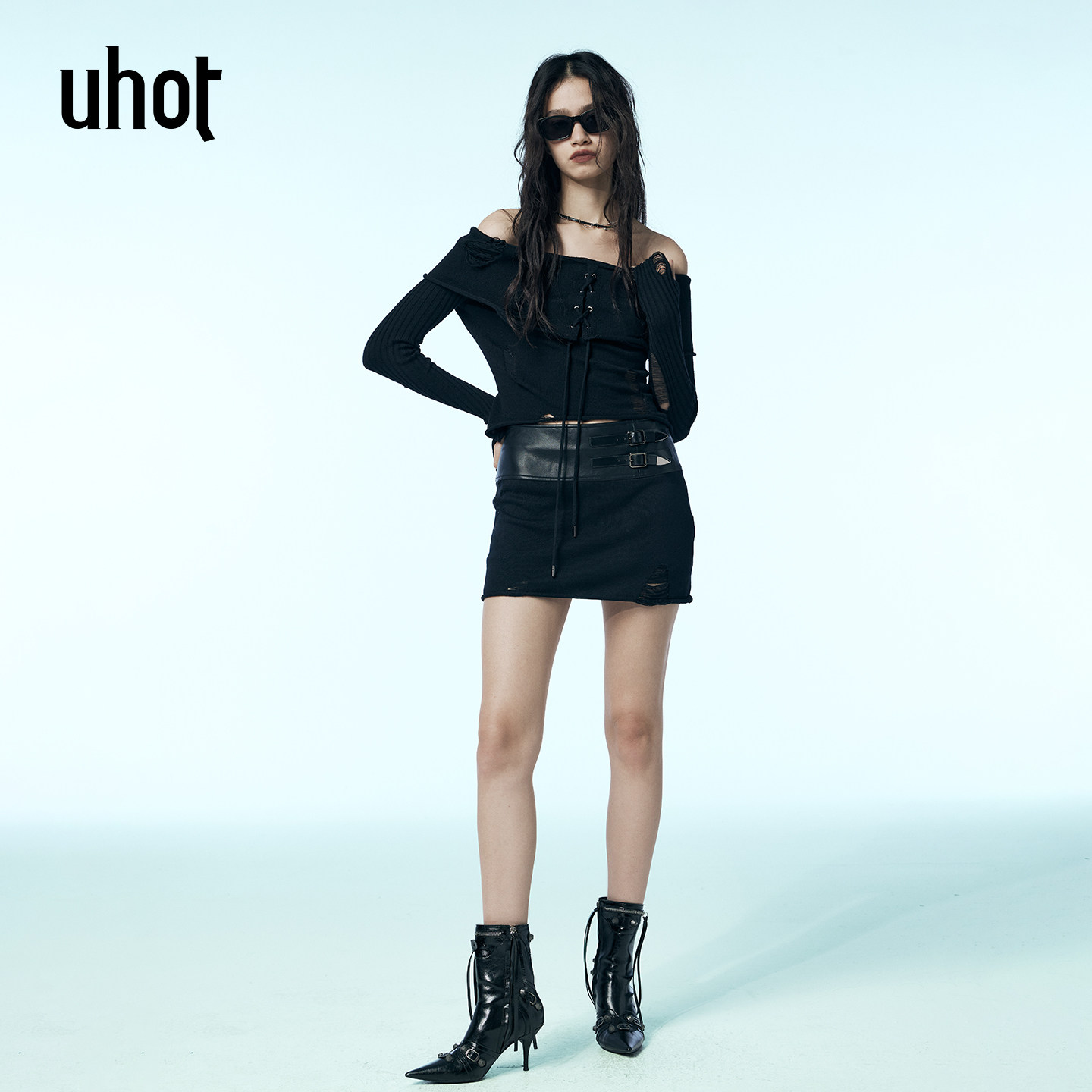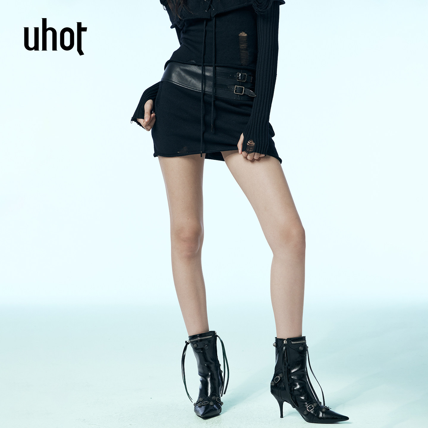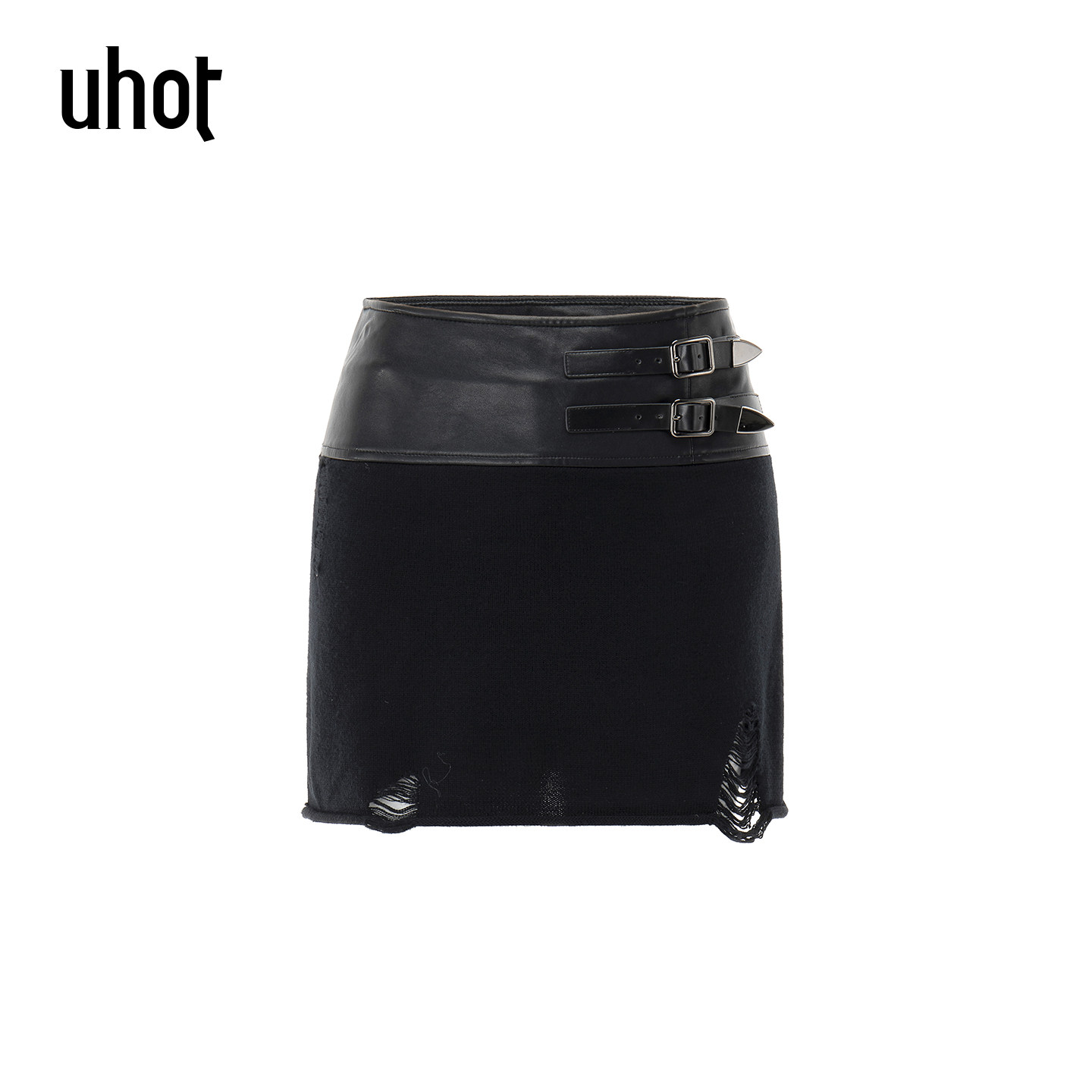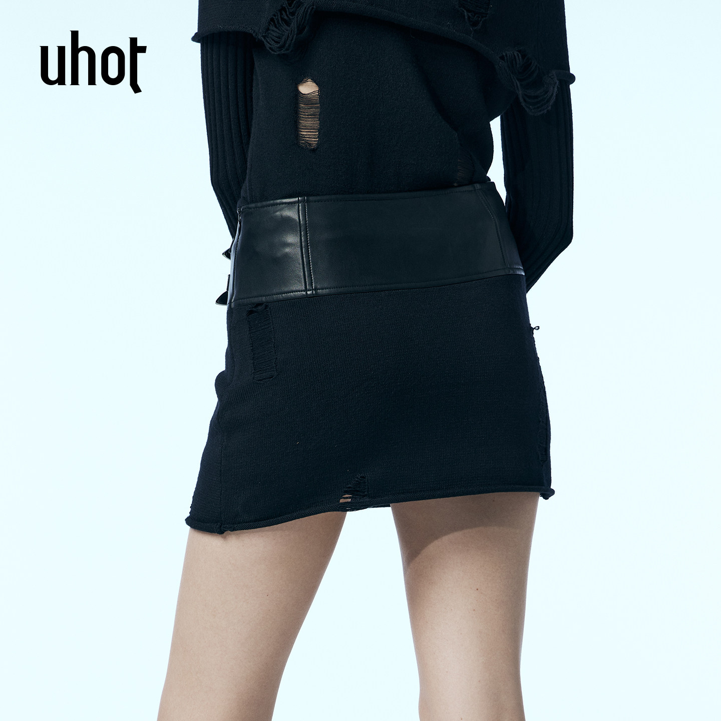 uhot 诱货黑色蛋白皮拼接针织高腰半身裙女性感破洞酷感UWWA2Q159