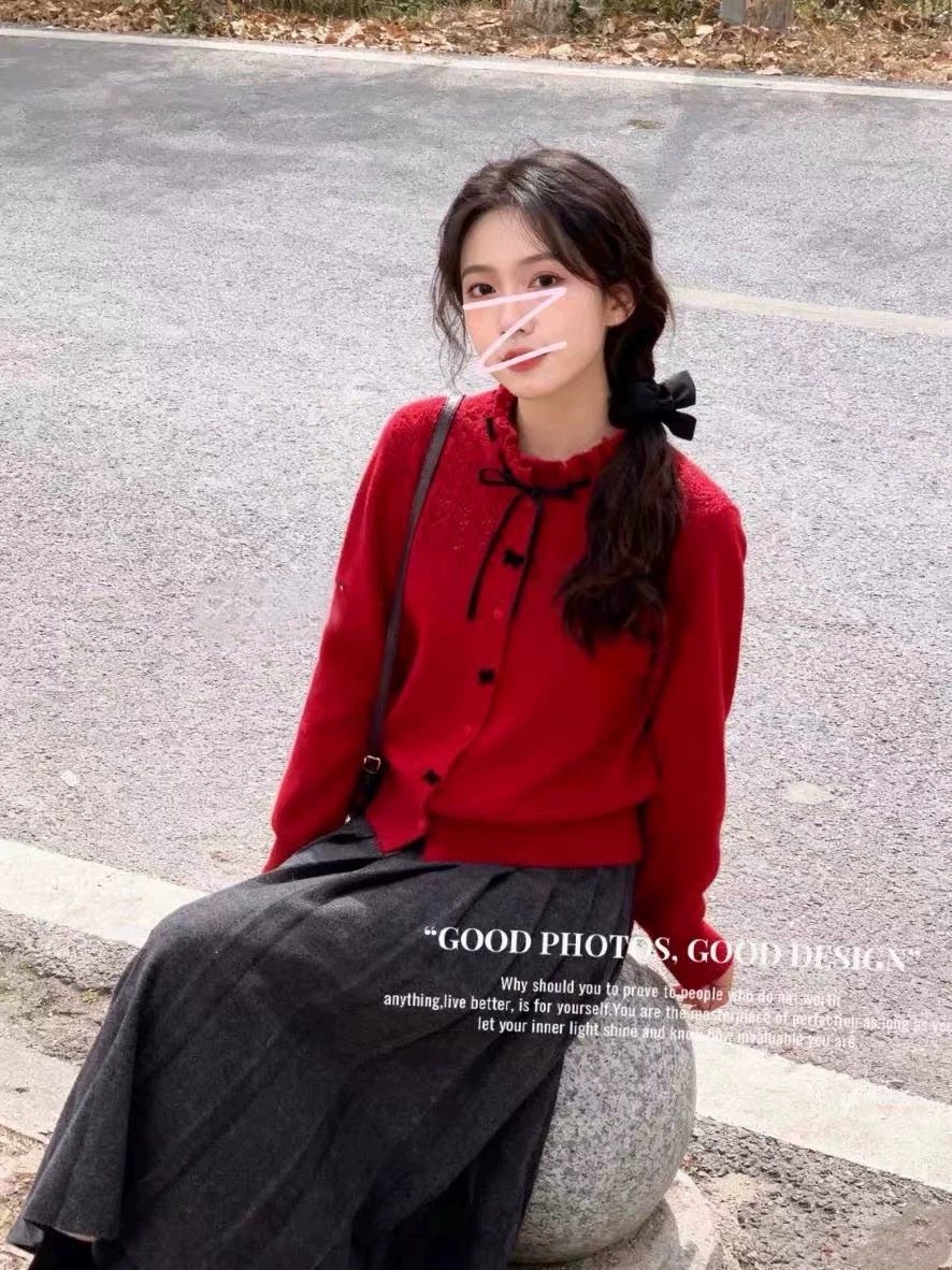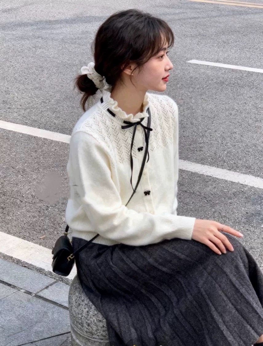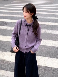 上衣 女超好看针织开衫 绵羊毛花朵领2025秋冬新款 蝴蝶结毛衣打底衫