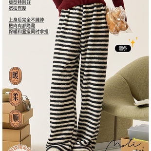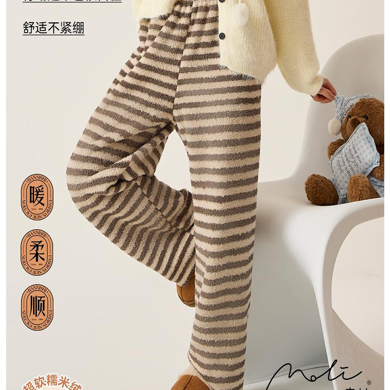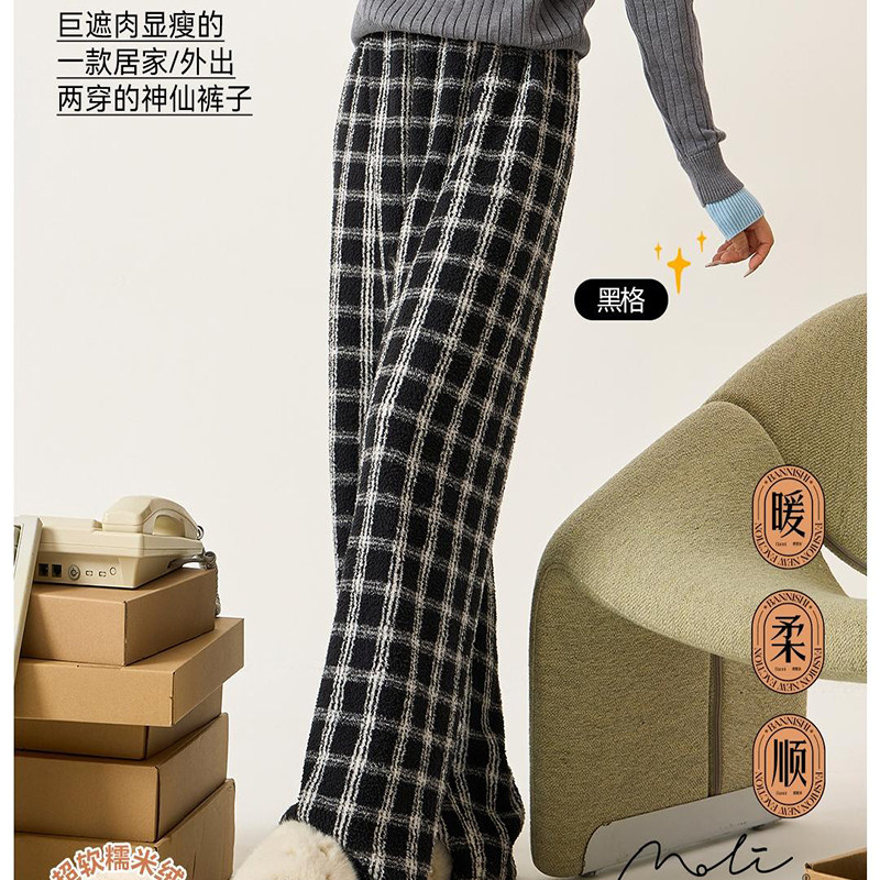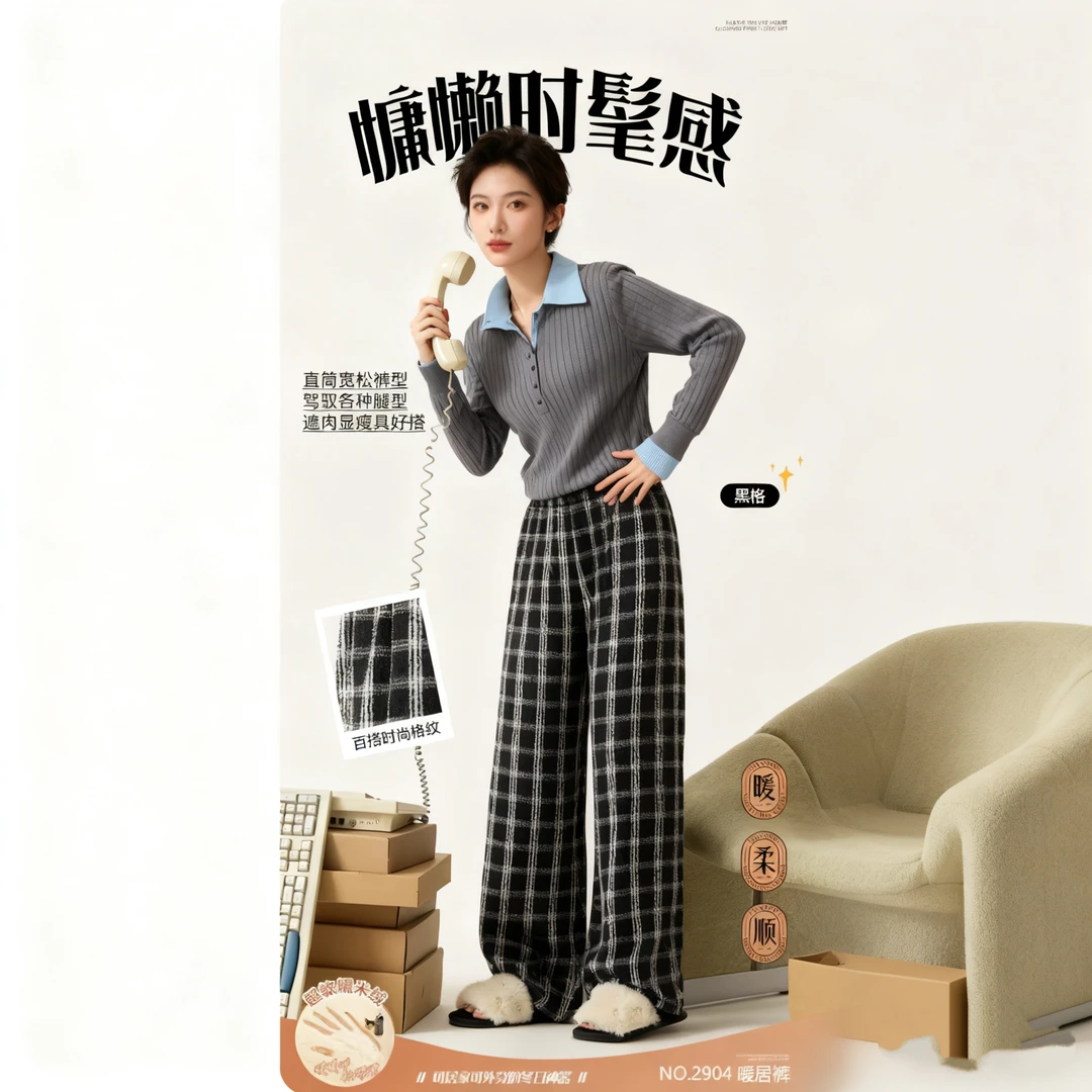 女款 可外穿暖暖裤 秋冬季 加绒复古英伦格慵懒家居裤 长裤 半边绒睡裤