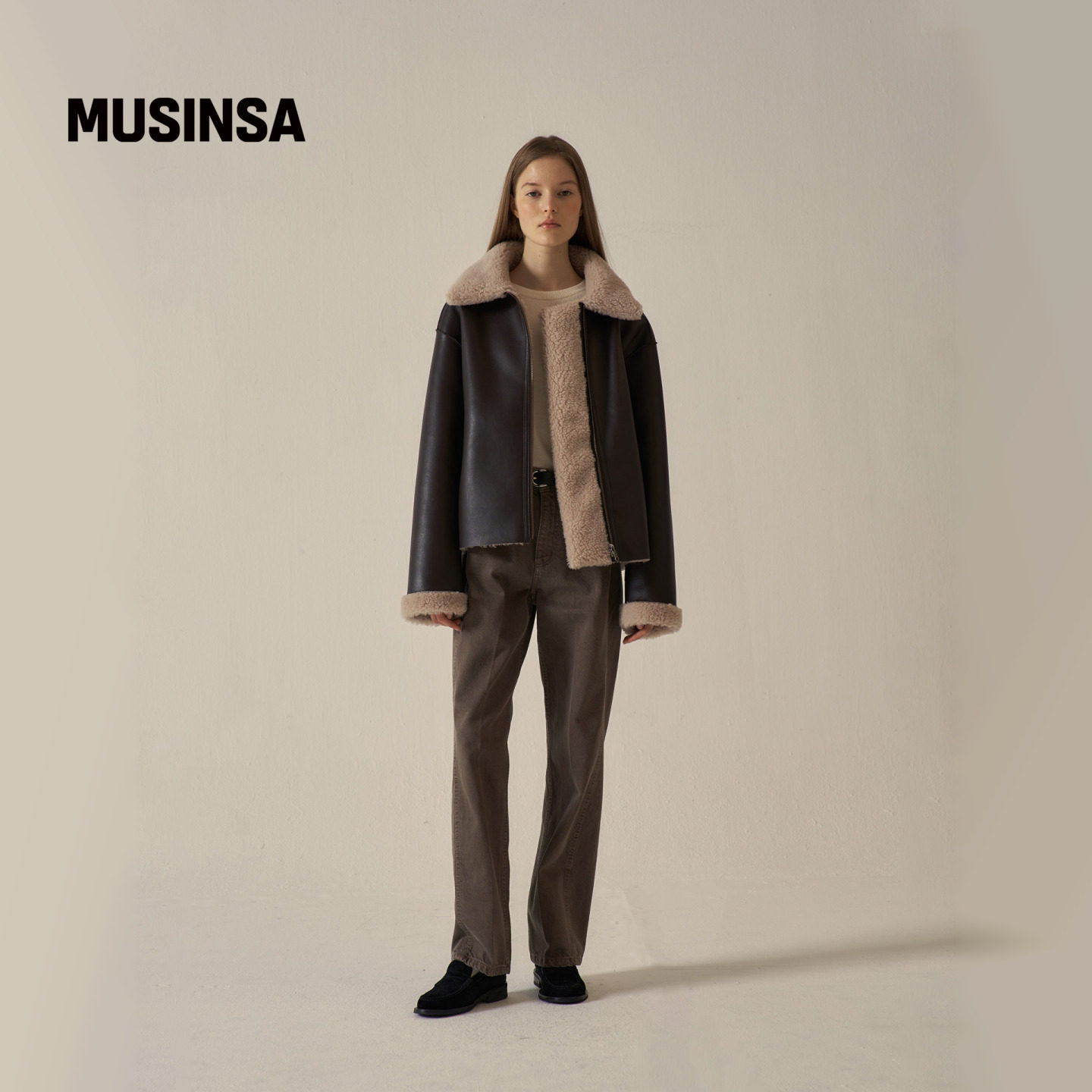 7Shiftin 收腰显瘦气质上衣 原创设计双色系带毛领拼毛呢外套冬季