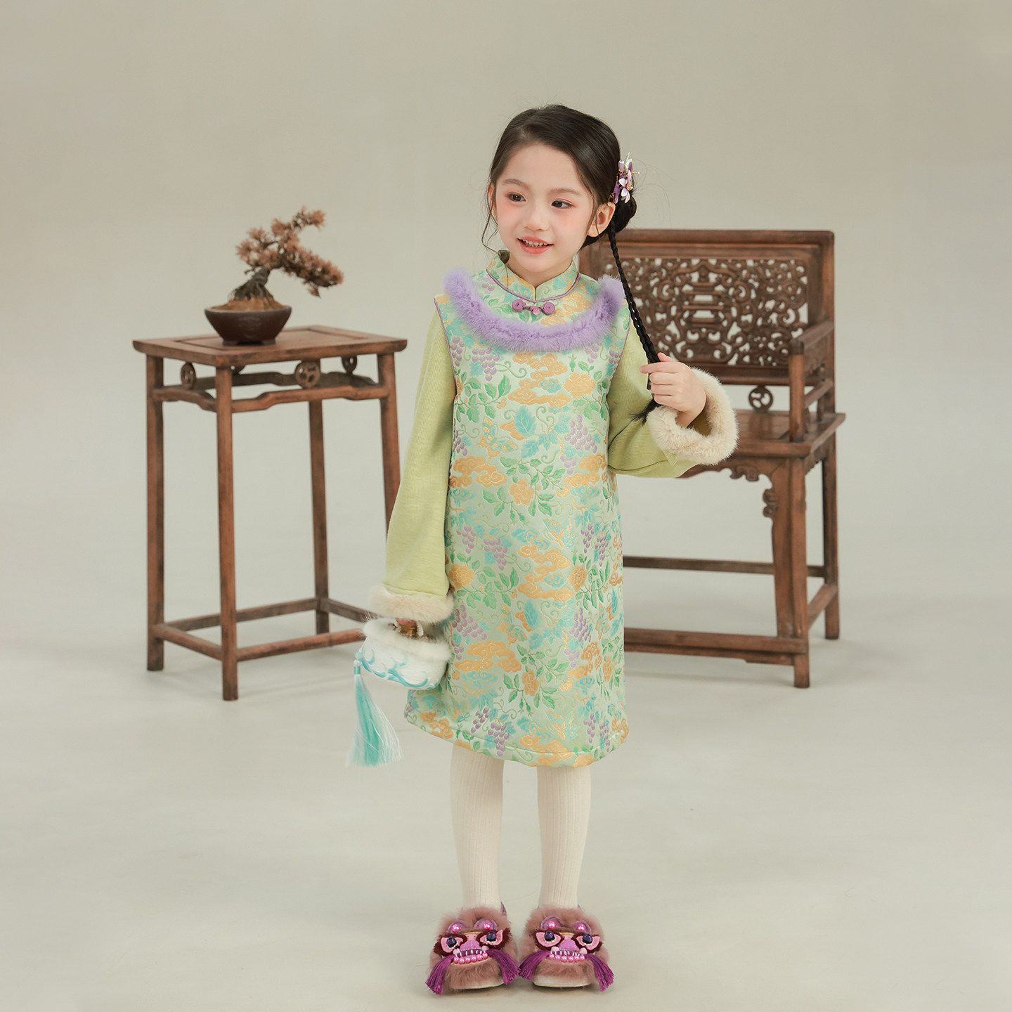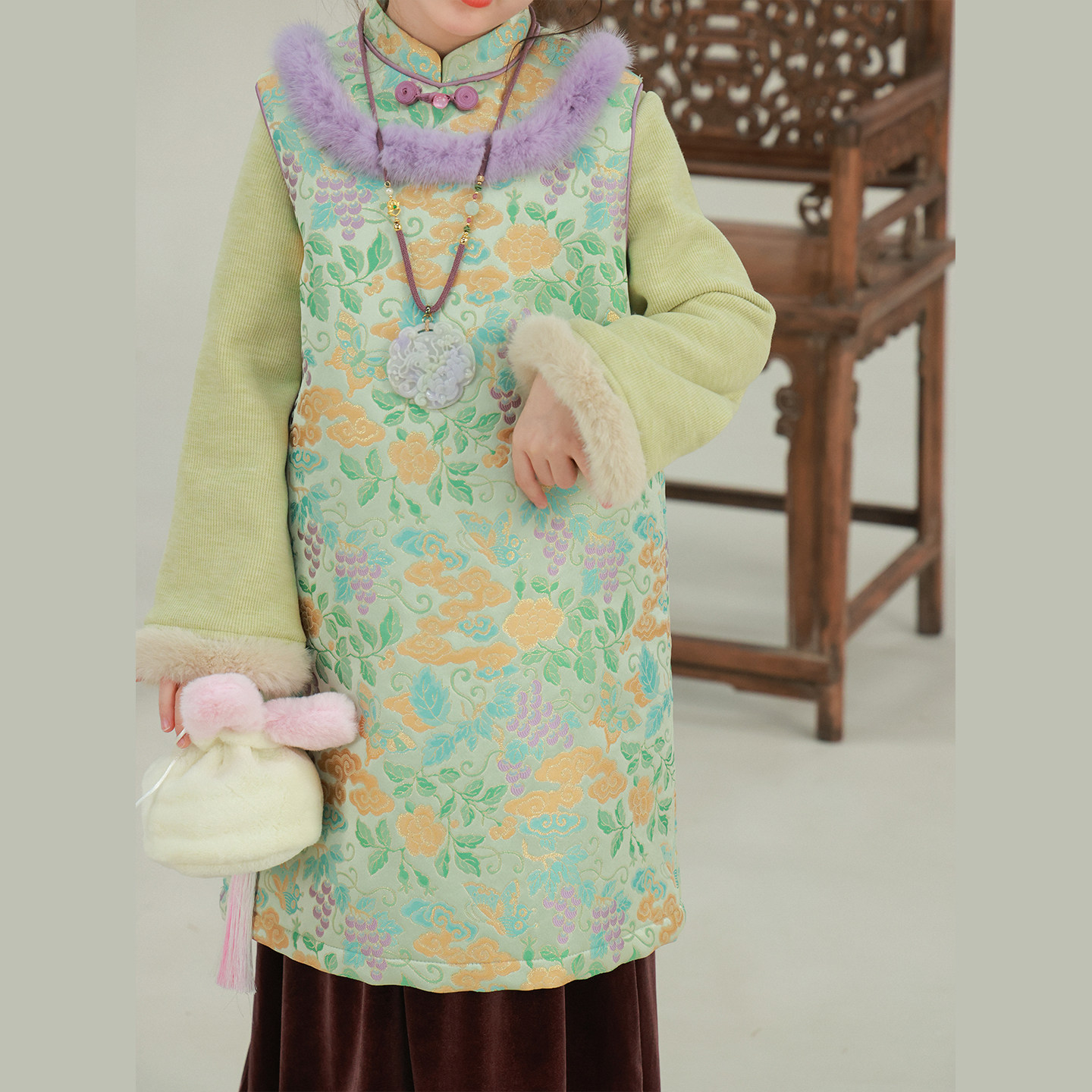 画报夫人原创丝绒兔毛步步生莲新式 棕色丝绒鱼尾裙 旗袍