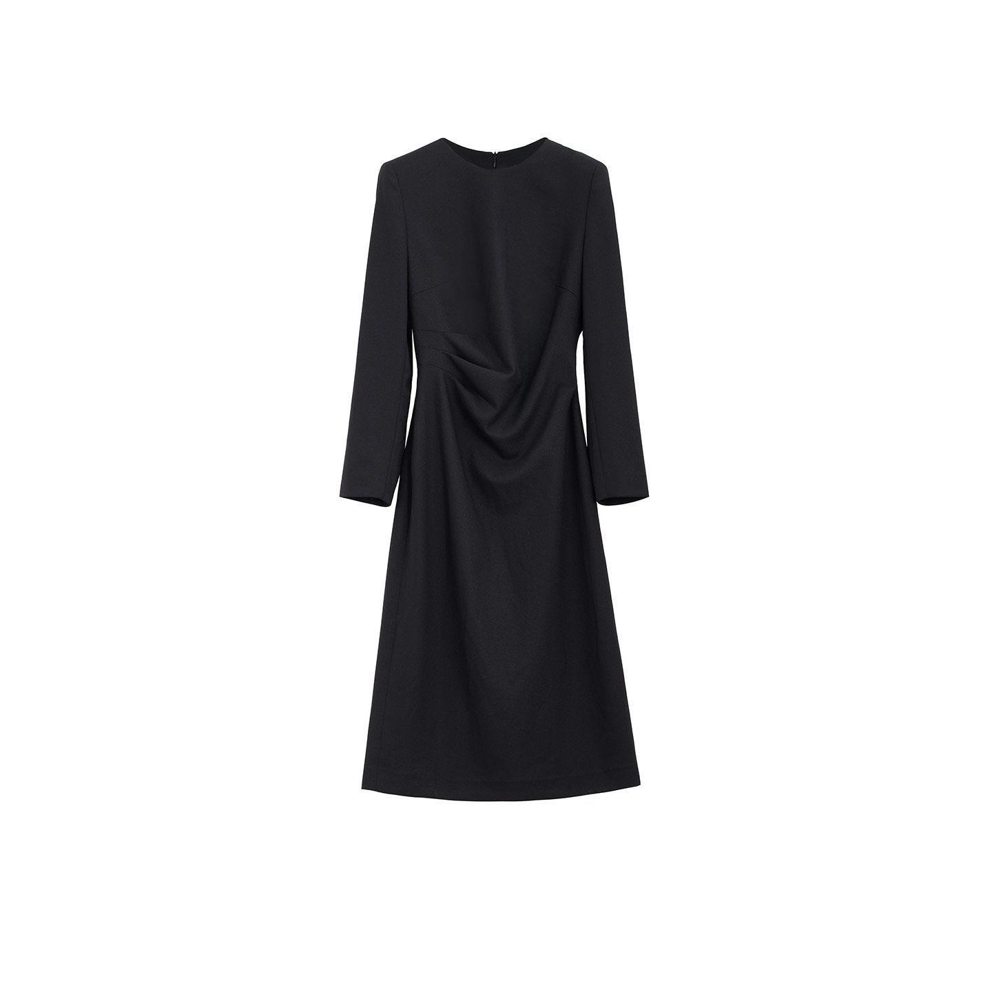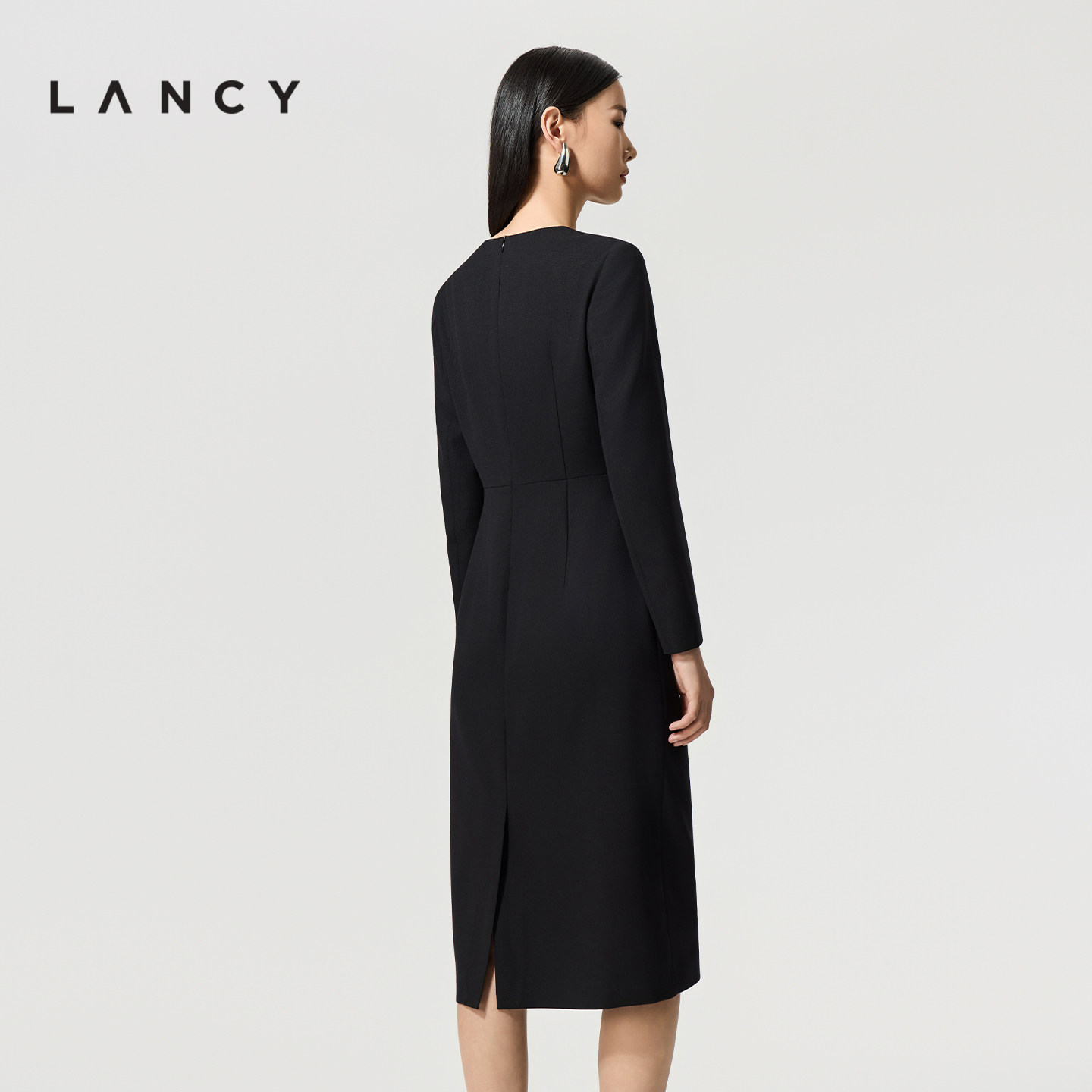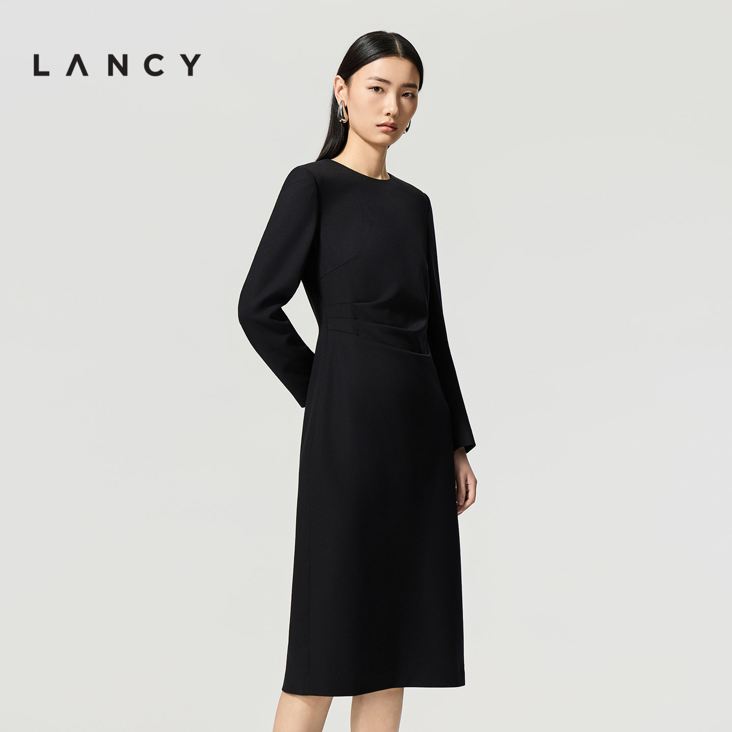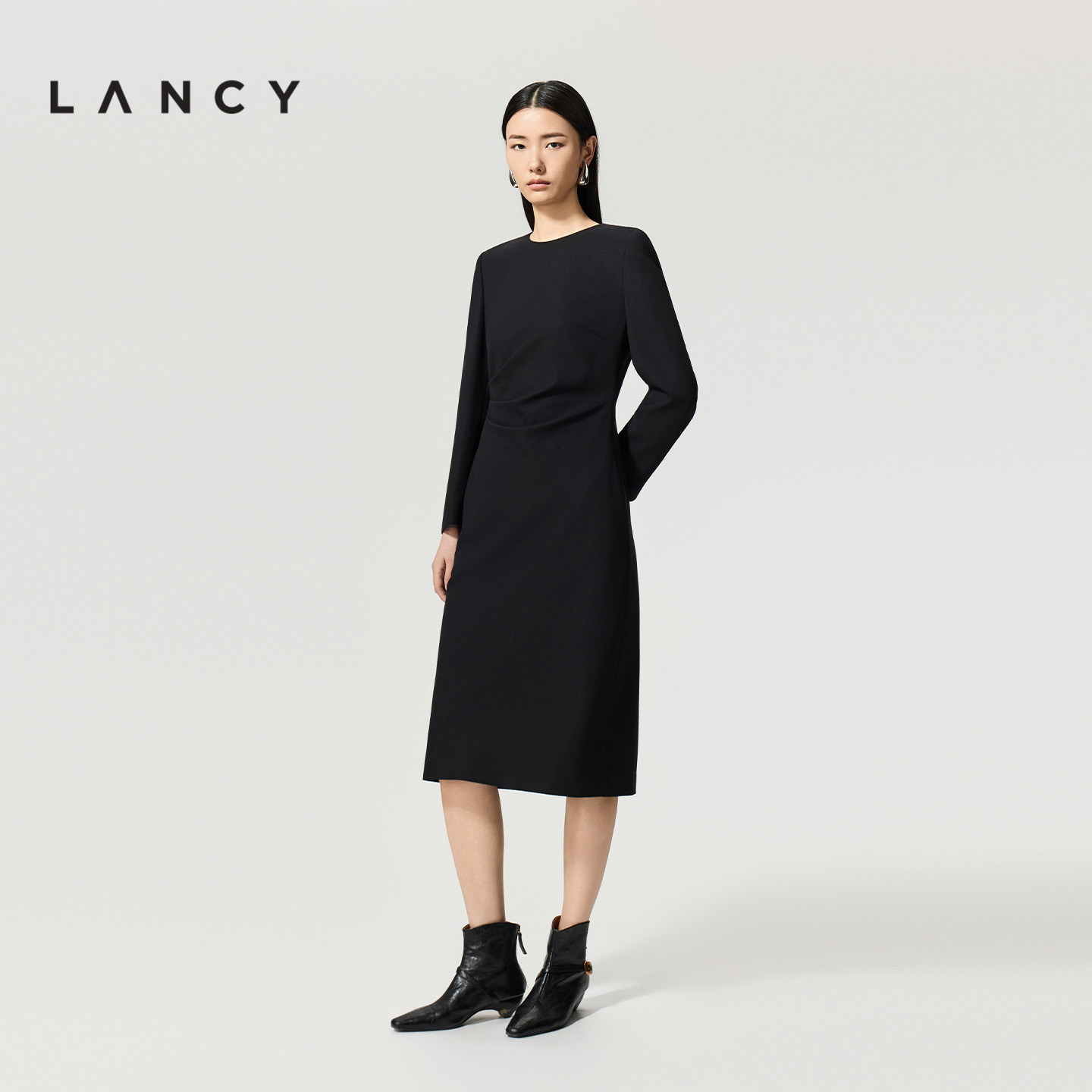 长袖 LANCY 气质捏褶收腰中长款 新款 高级感羊毛连衣裙 朗姿2026春季
