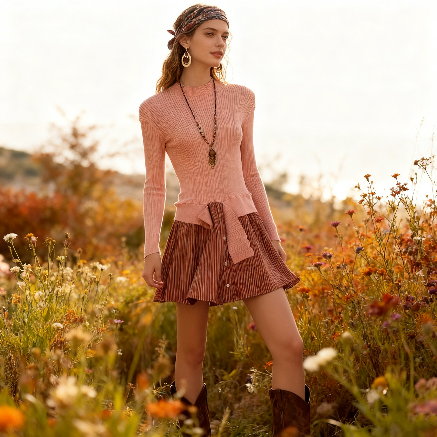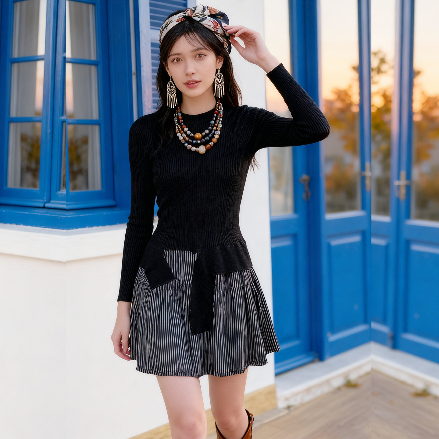 长袖 波西米亚风拼接针织衫 连衣裙短裙女春秋 原始设计感 公司单