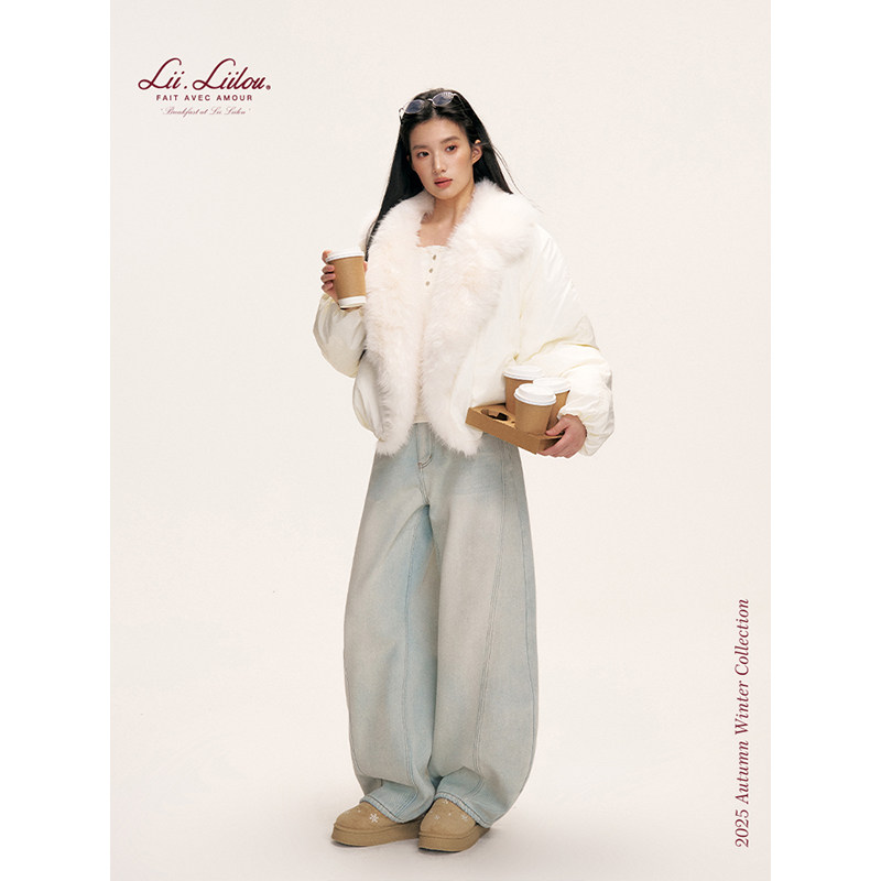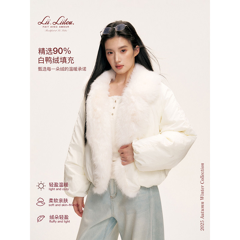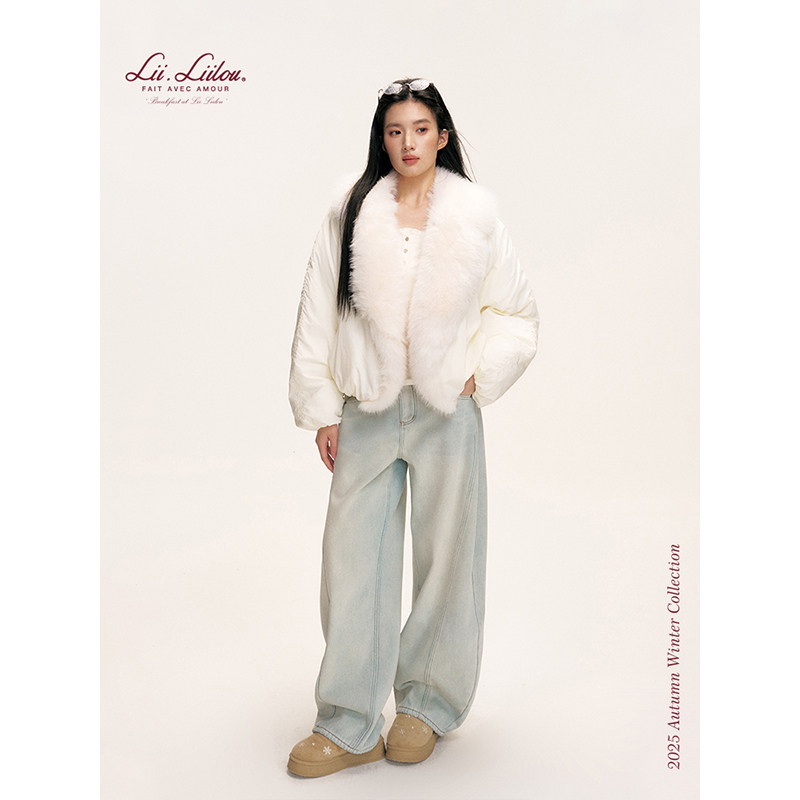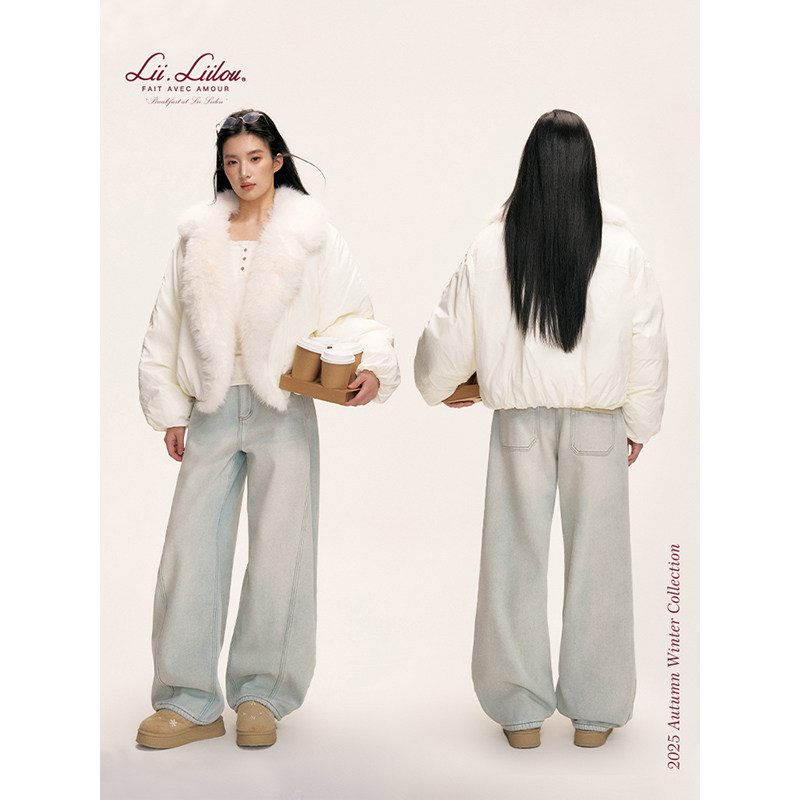环保毛领拼接宽松白色羽绒服保暖外套 毛绒冬日 Liilou 25aw