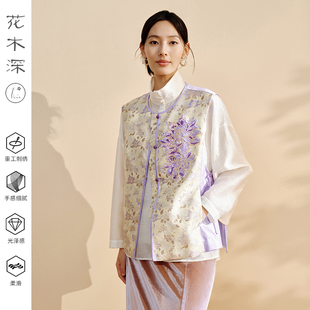 名家钱小萍带钢印宋锦马甲花木深圆领对襟珠绣背心女新款 真丝马夹