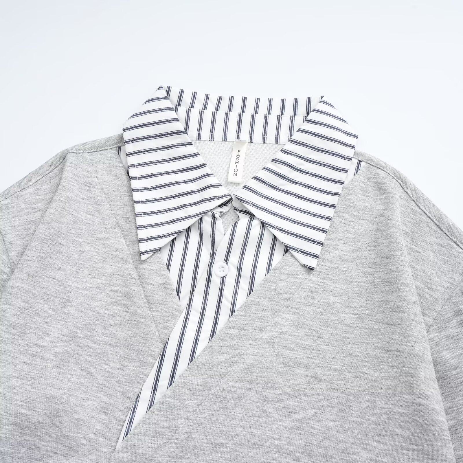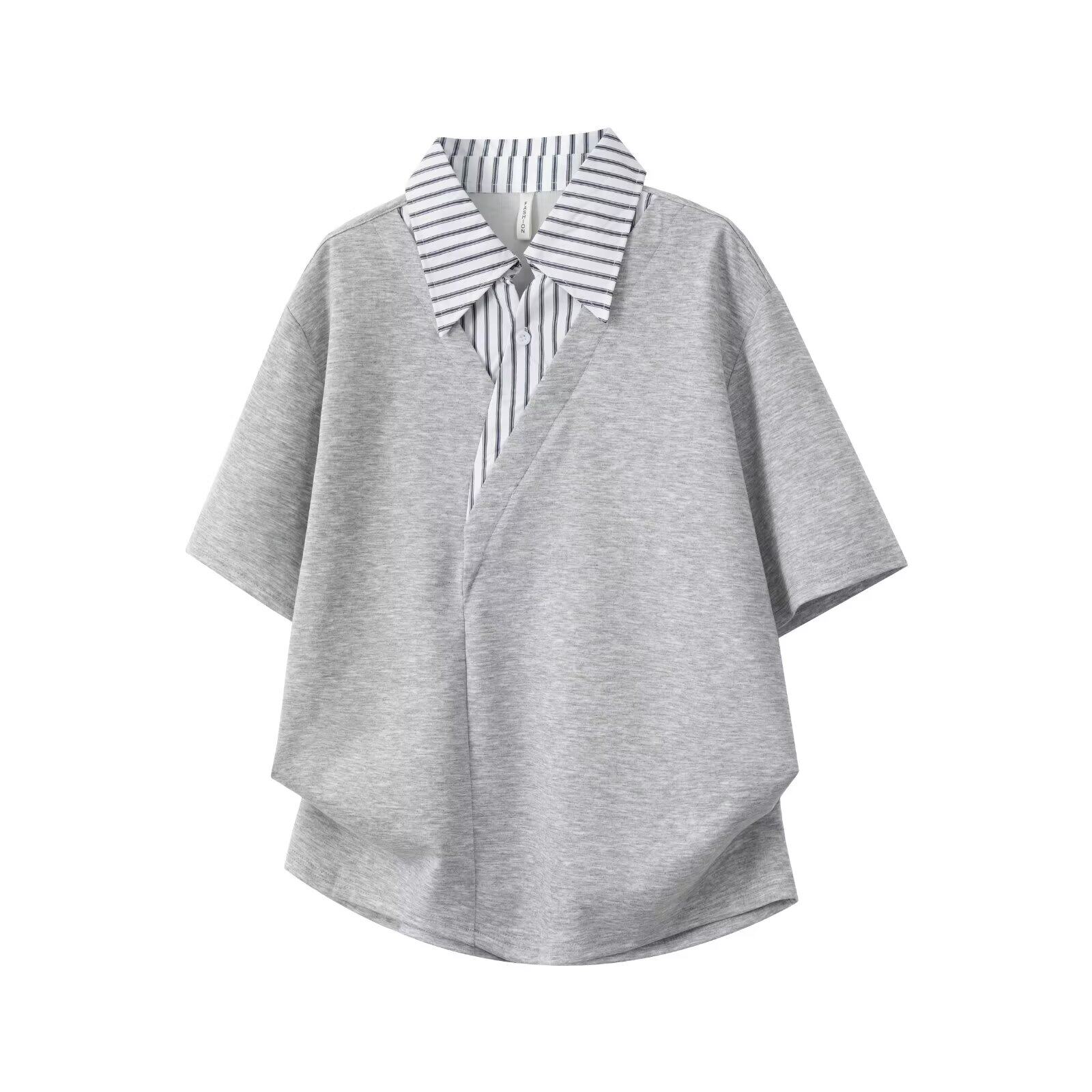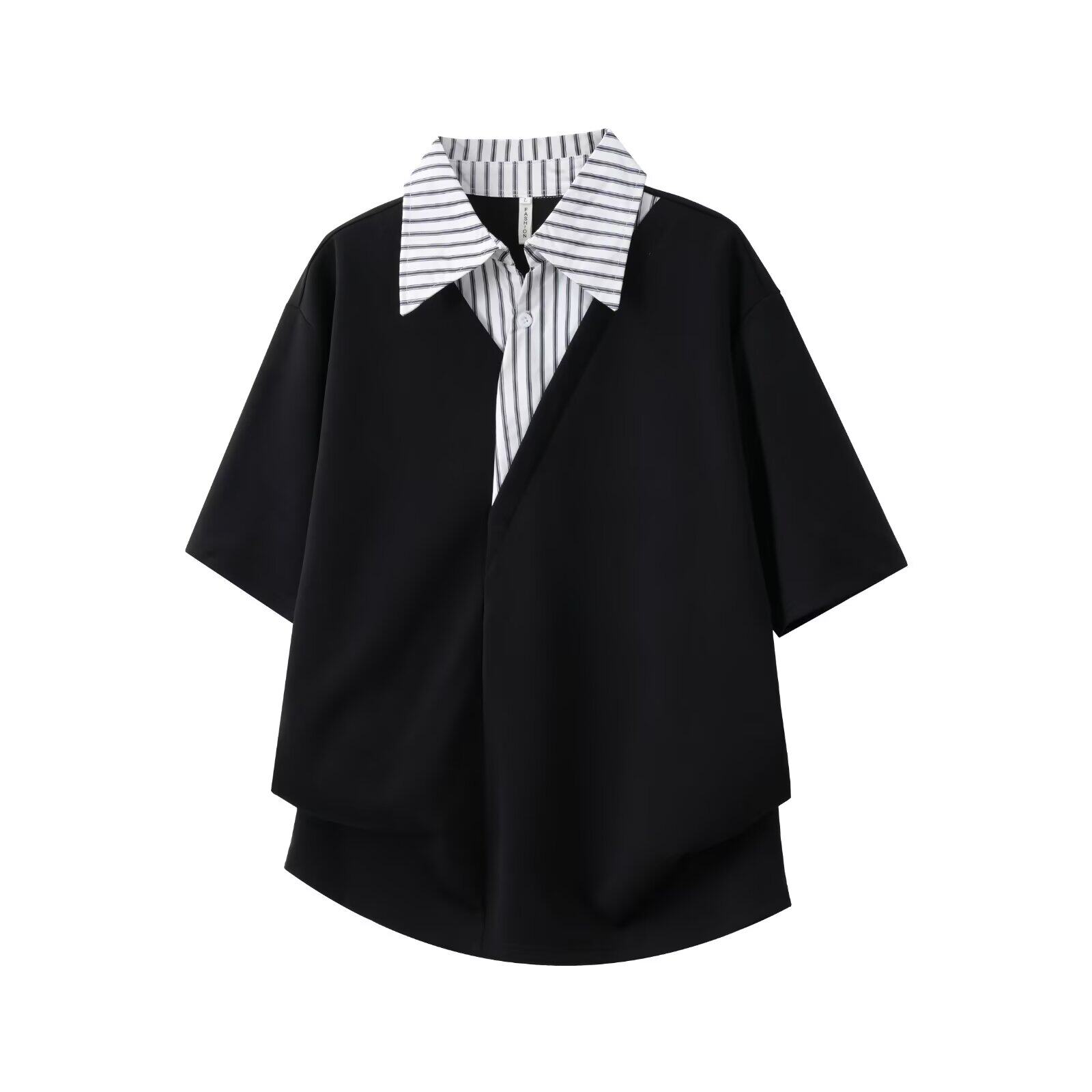 外穿体恤 宽松休闲学院风Polo衬衫 条纹翻领拼接假两件短袖 男女新款