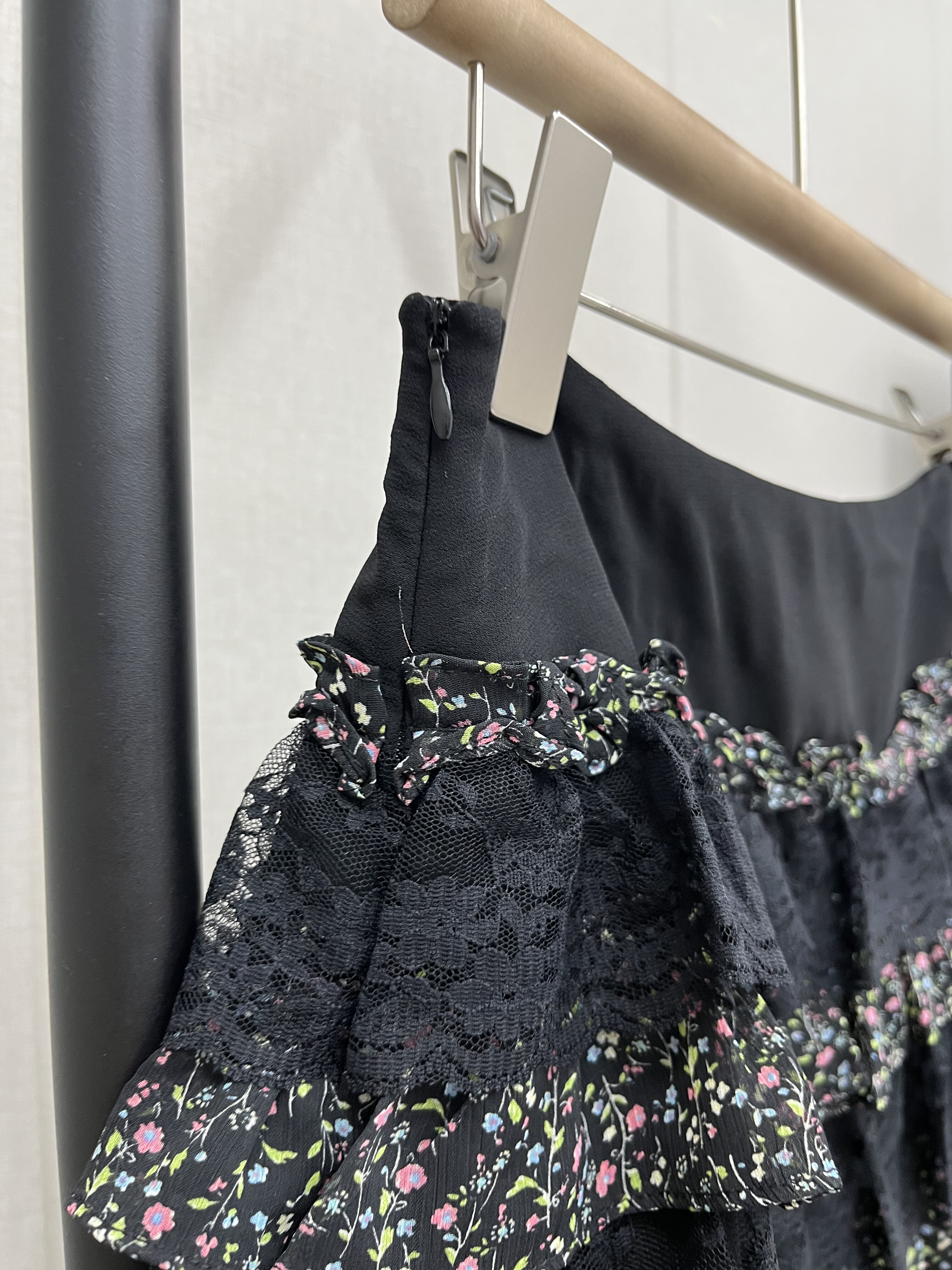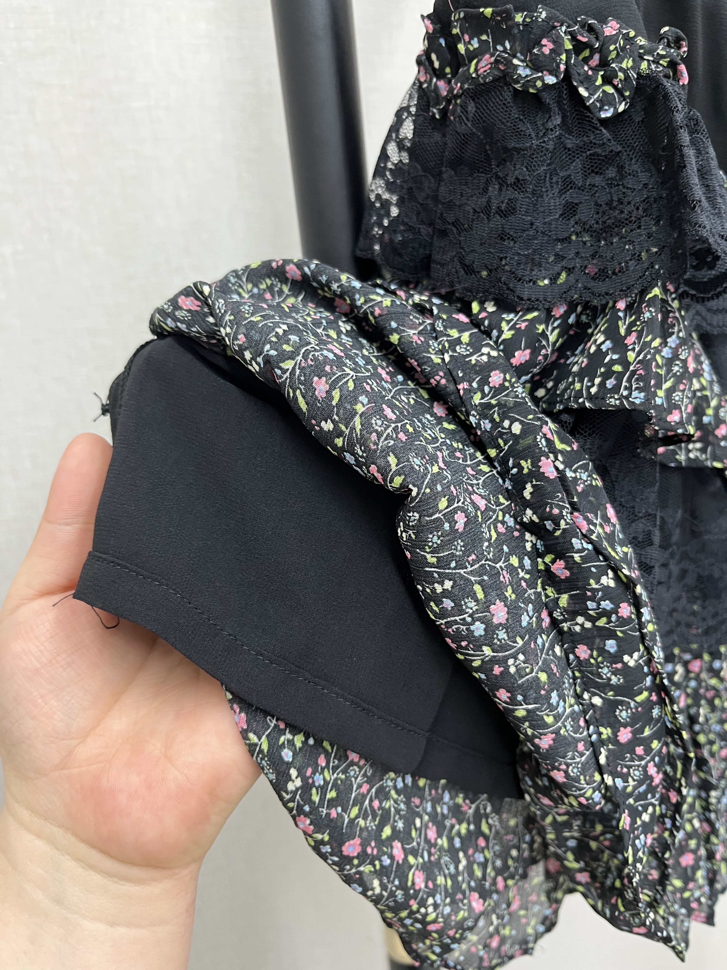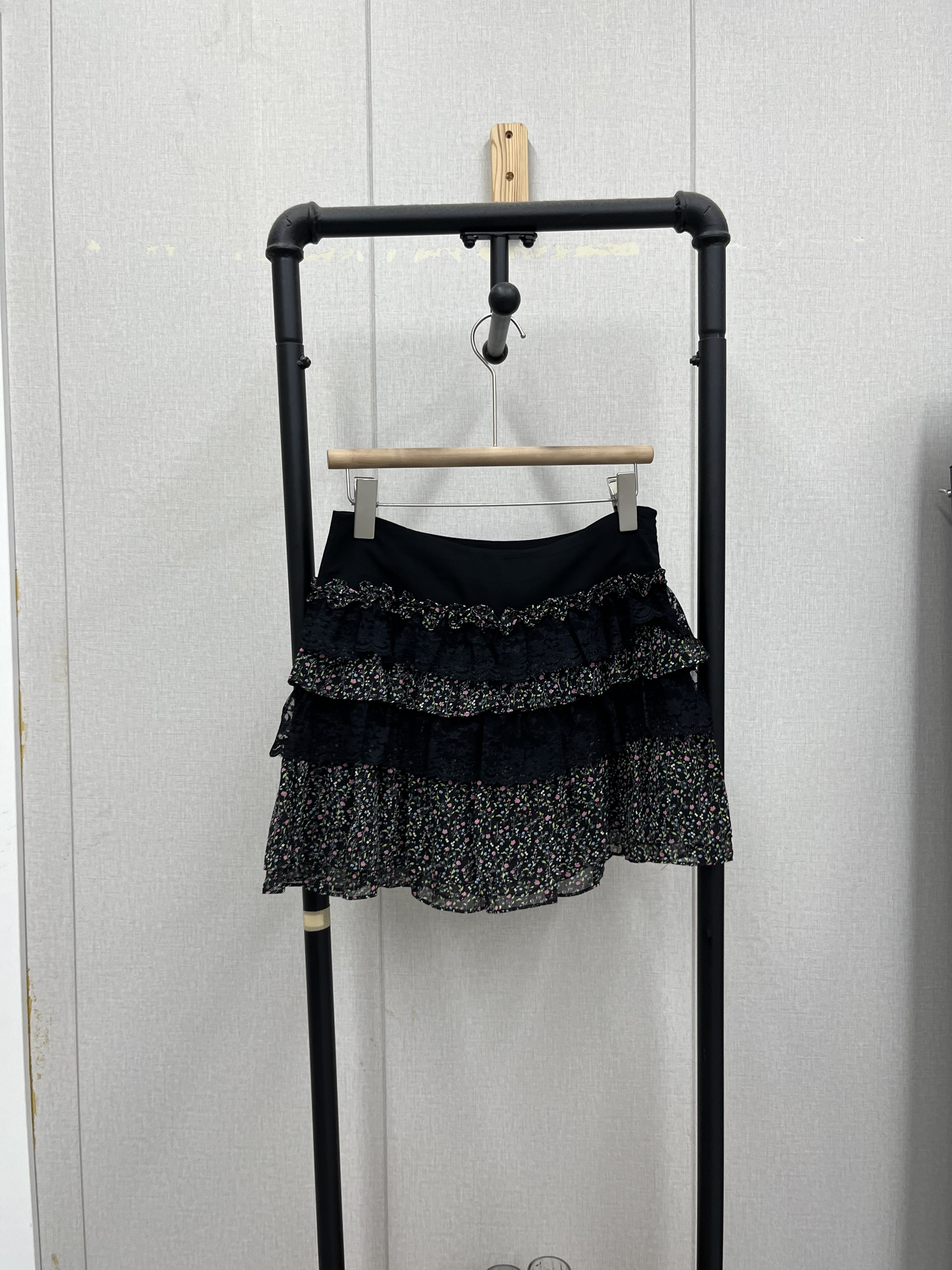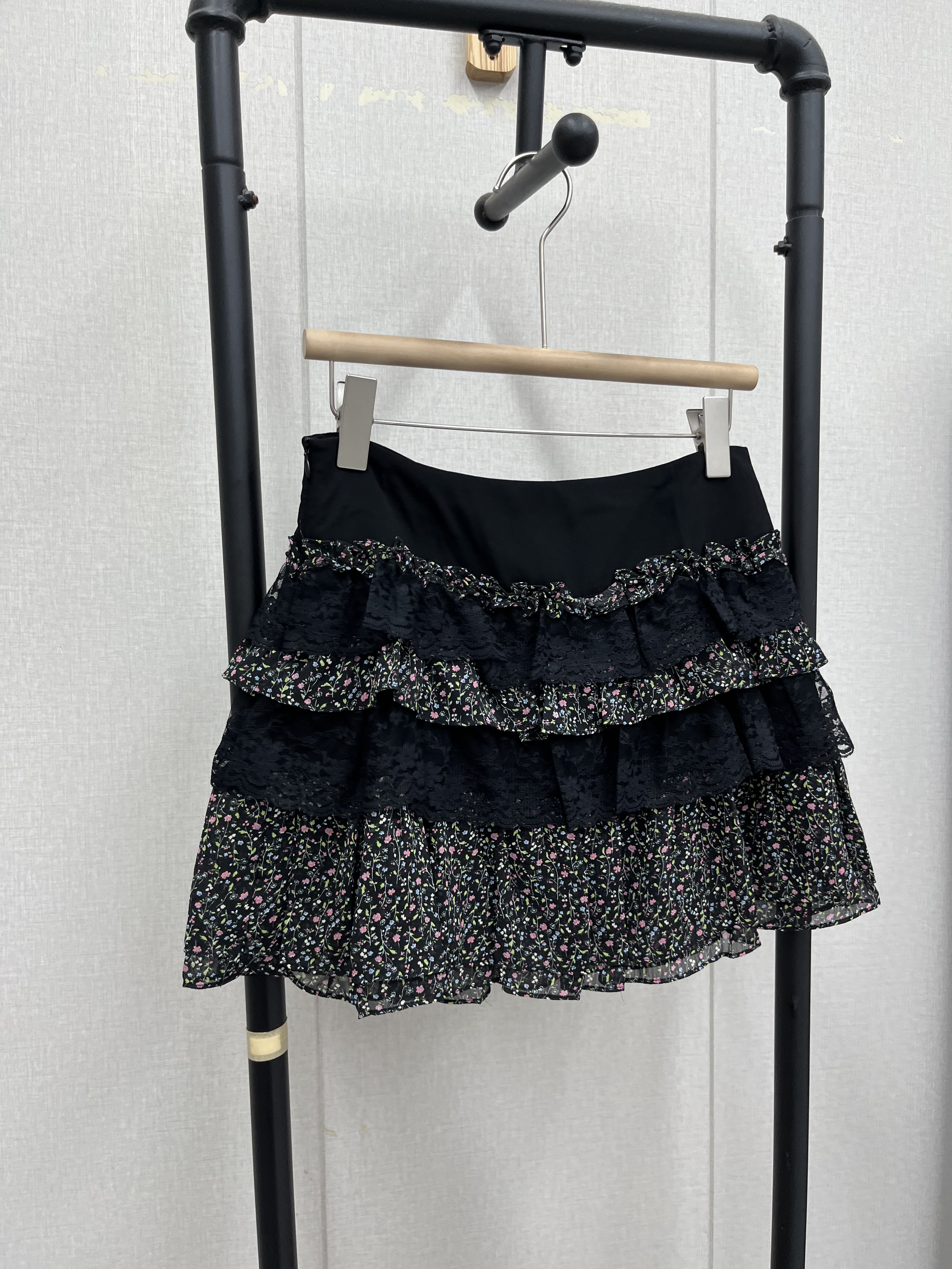 碎花荷叶边高腰A字短裙夏季 百搭显瘦蛋糕裙蕾丝拼接