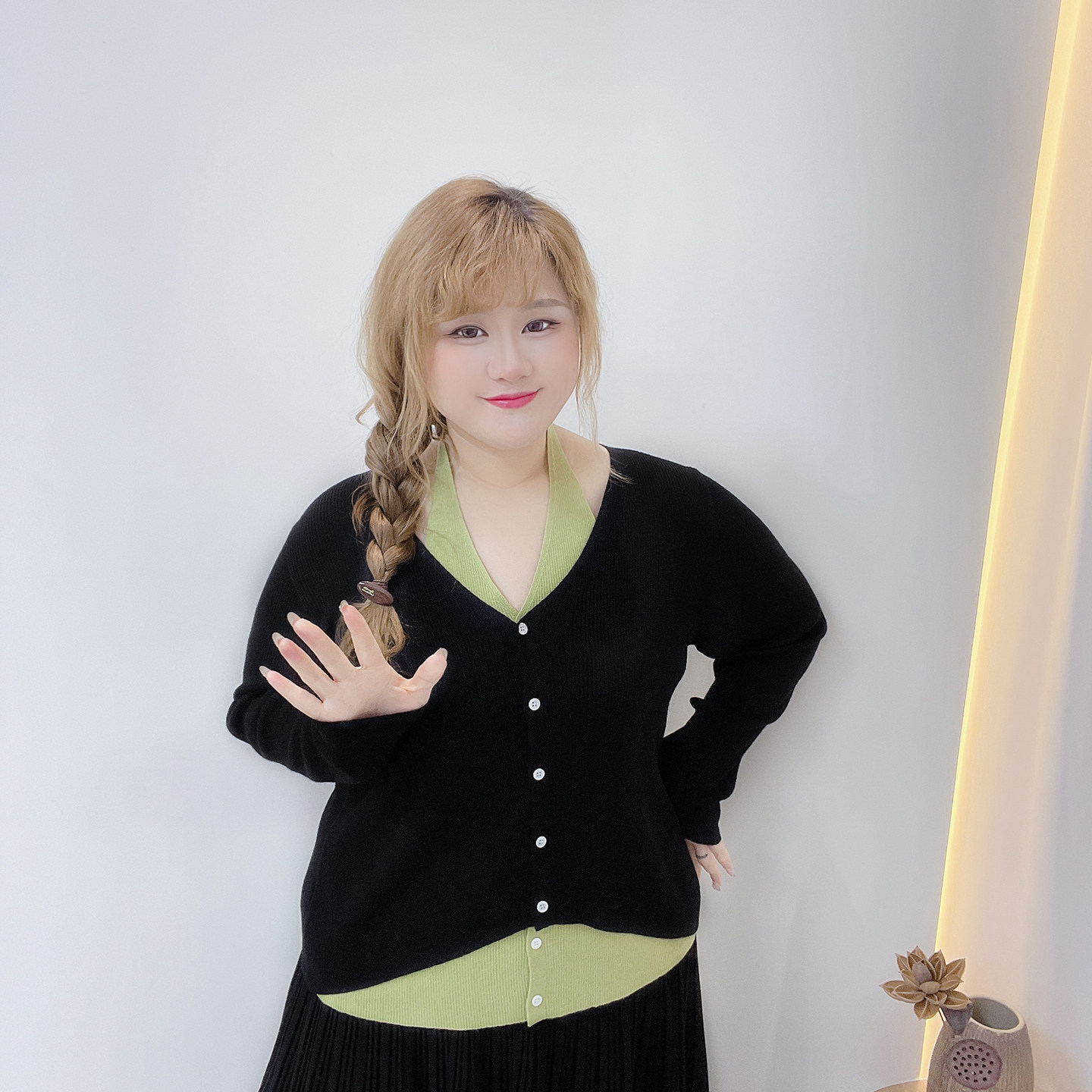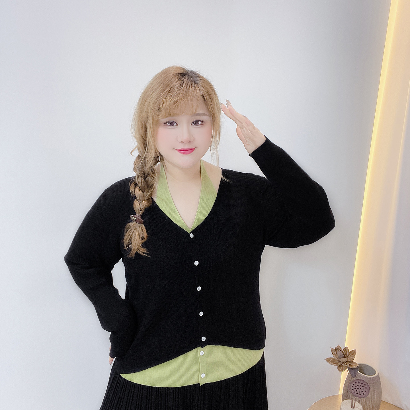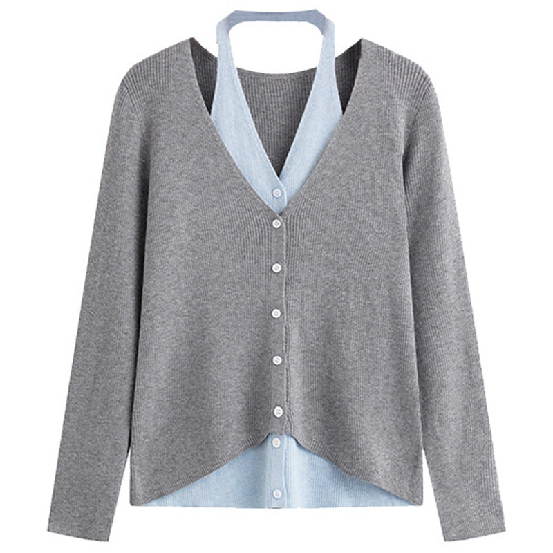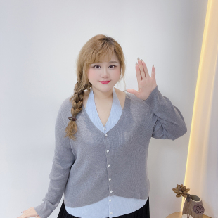 挂脖弹力显瘦针织衫 韩系纯欲风设计感撞色假两件胖莹莹大码 女装