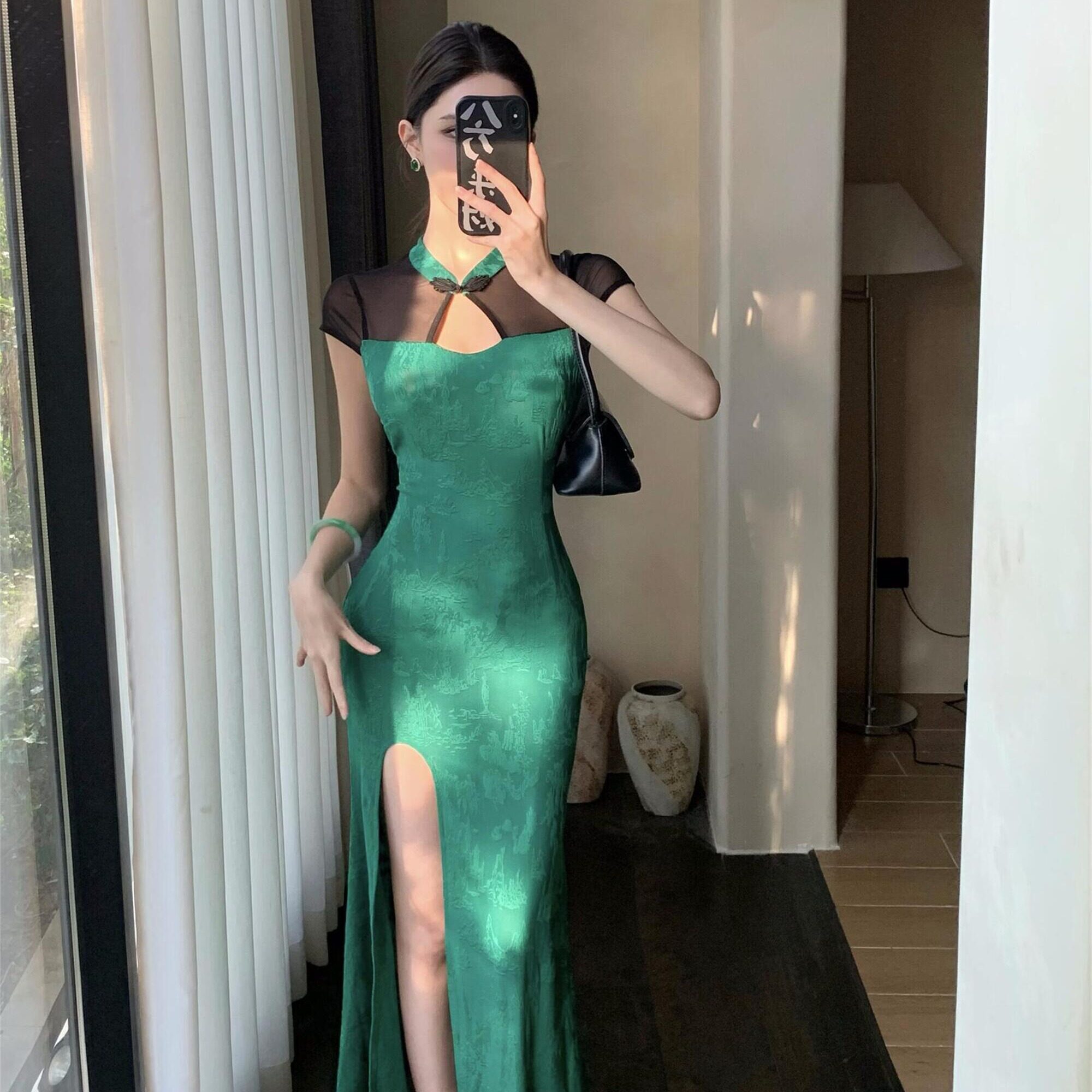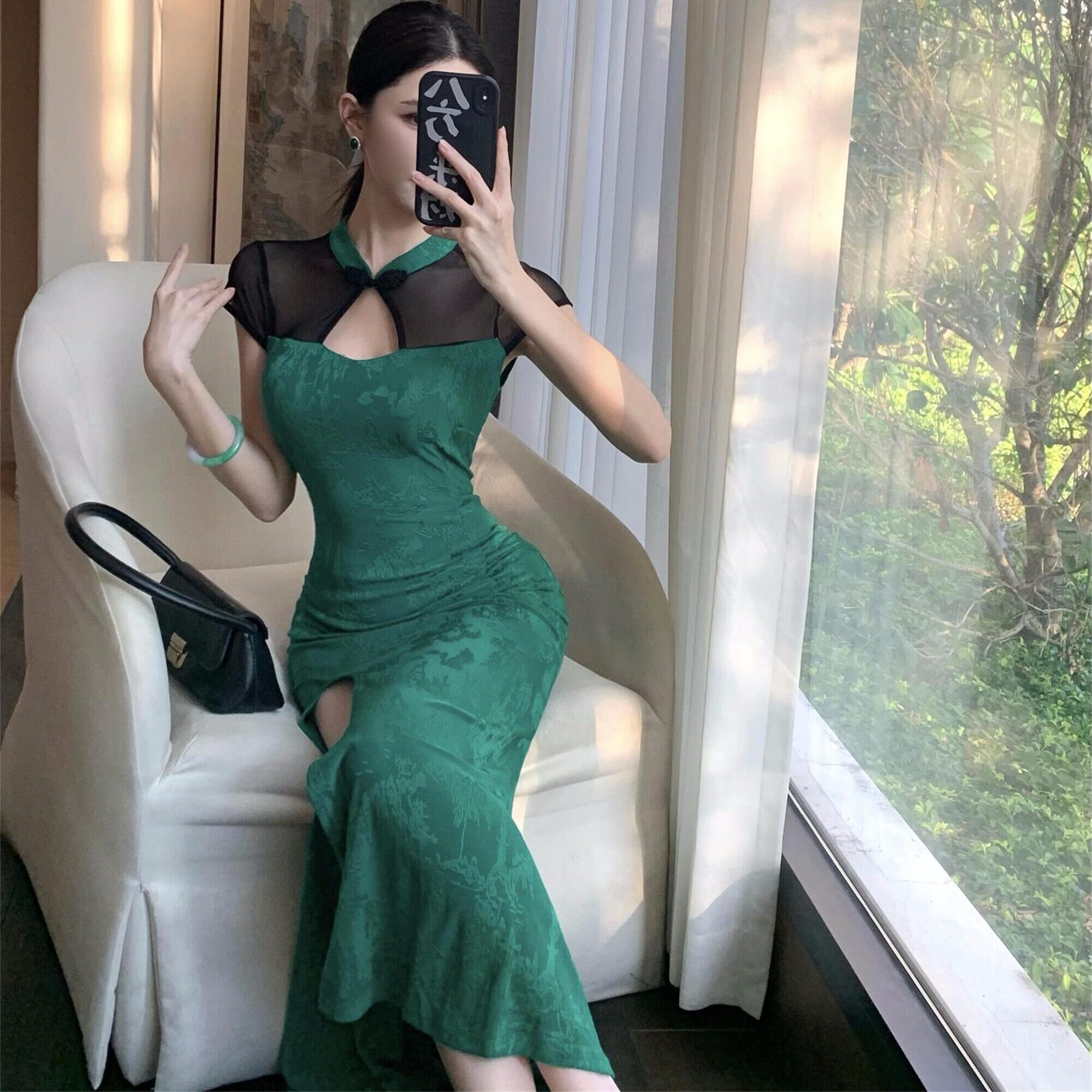 新中式 包臀开叉长裙 改良旗袍连衣裙女技师工作服性感网纱拼接修身