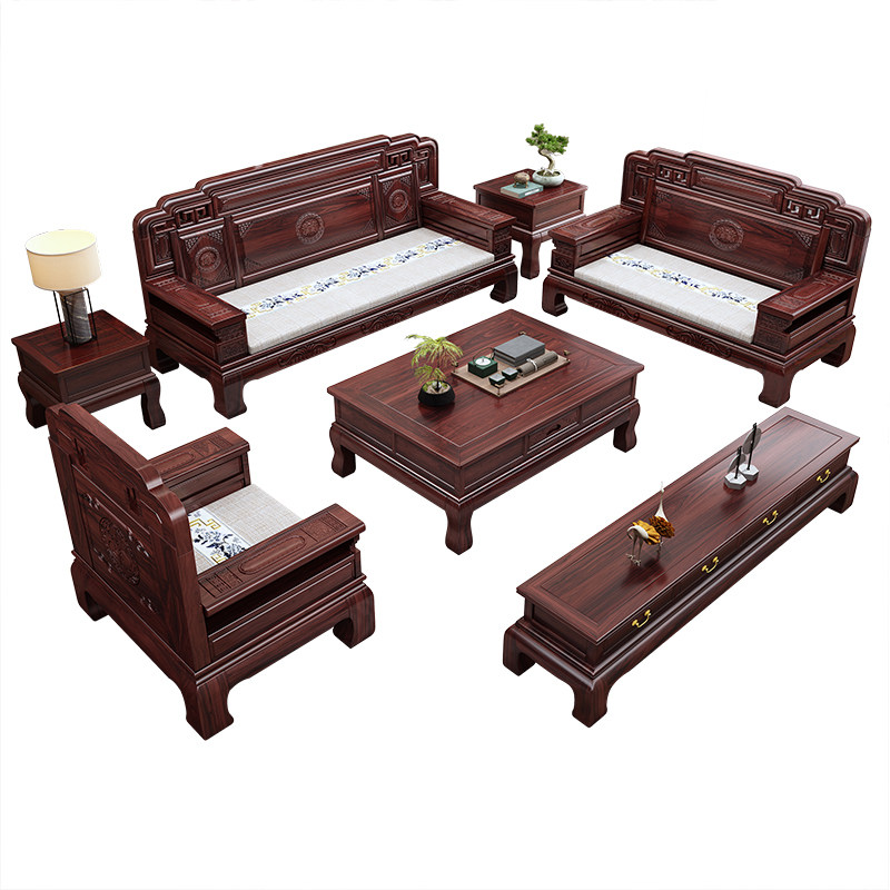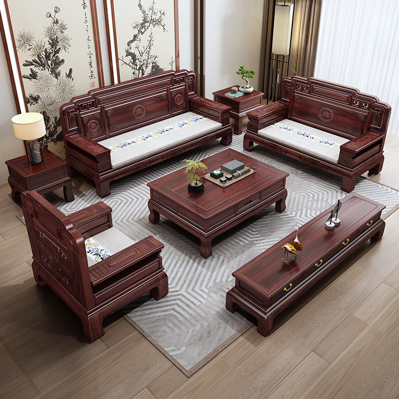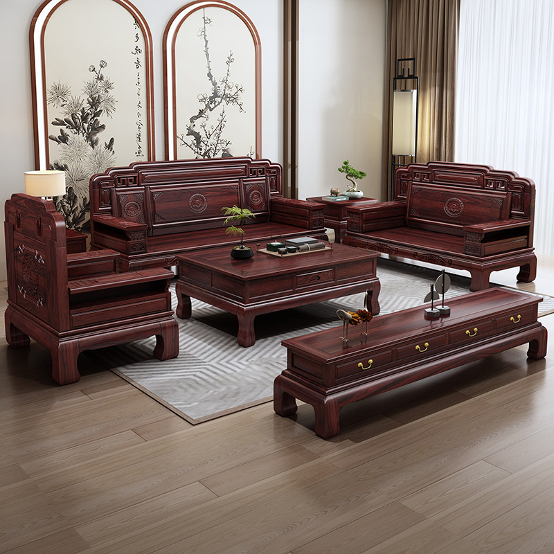 新中式 乌金木仿古雕花客厅家用冬夏两用家具 实木沙发组合2026新款