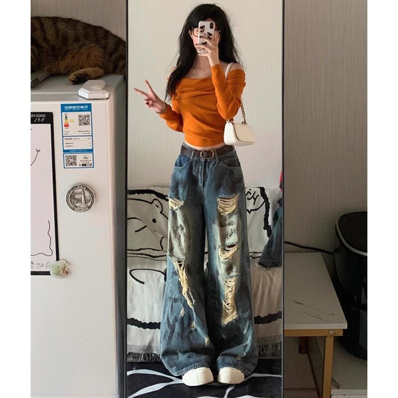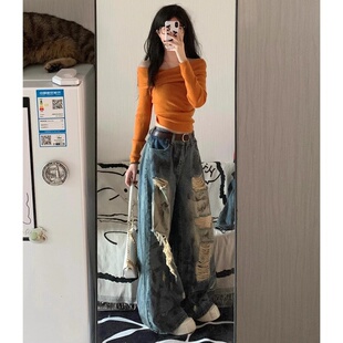 女辣妹潮流百搭宽松显瘦阔腿拖地长裤 破洞做旧牛仔裤 2026新款 夏季