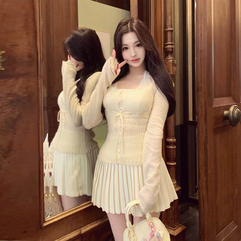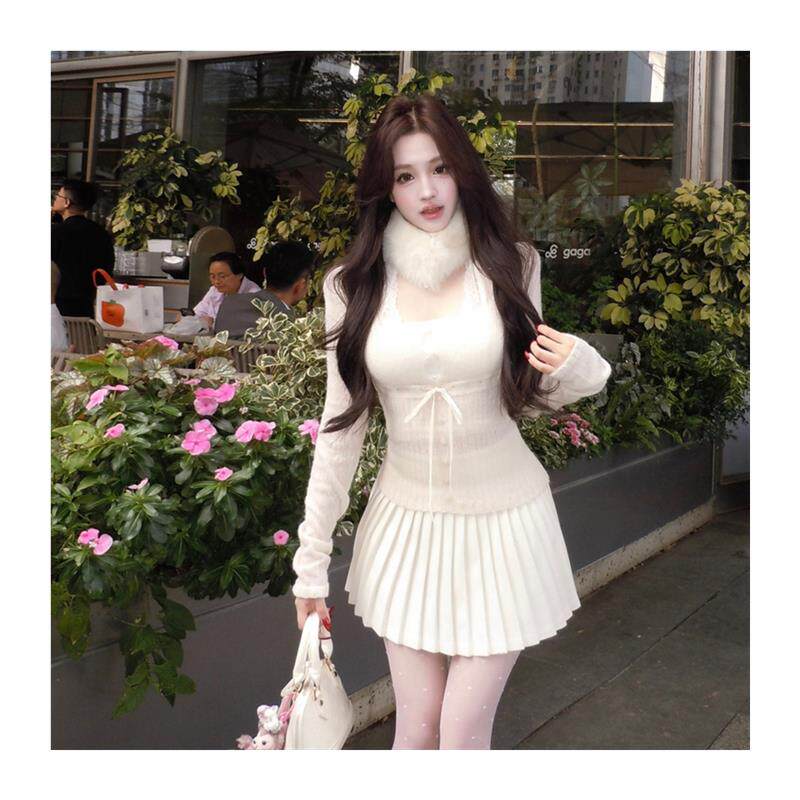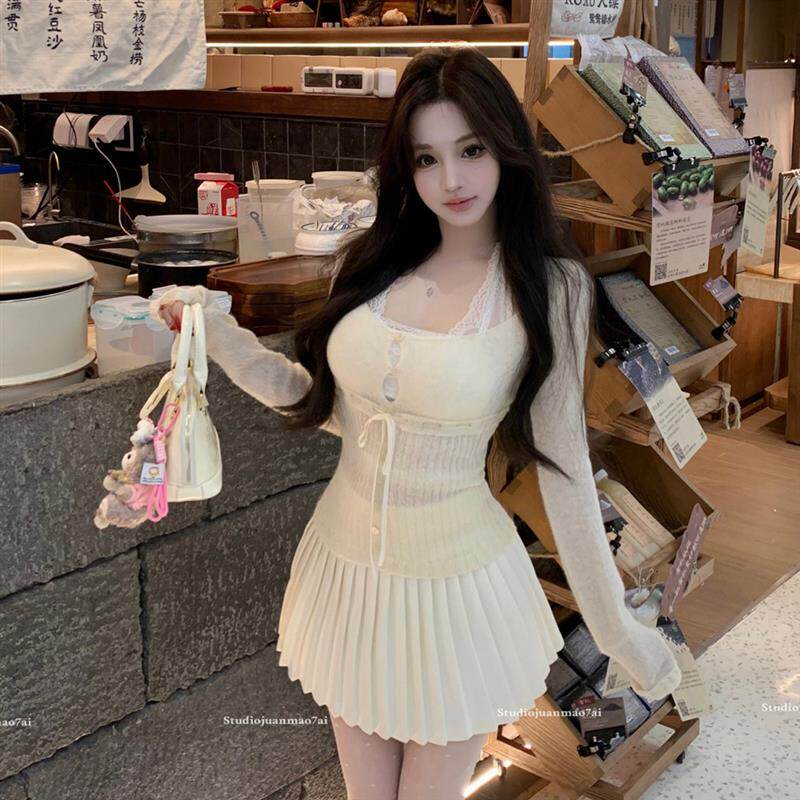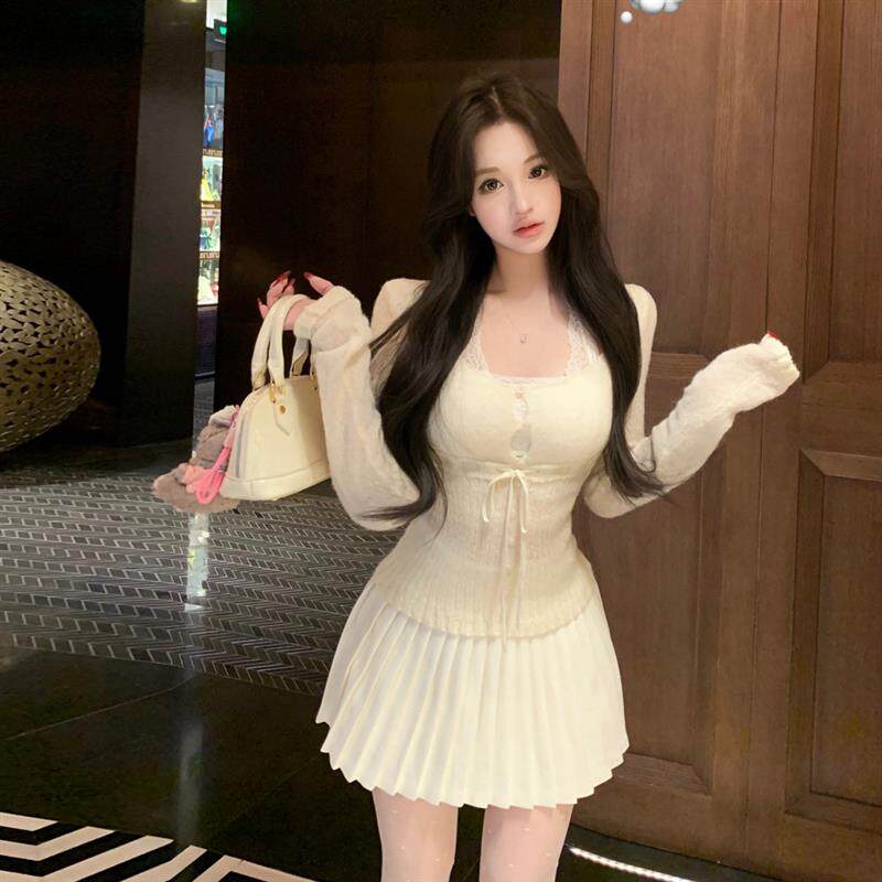 甜美少女韩系减龄内搭蕾丝吊带针织U领长袖 上衣丝袜百褶半裙套装
