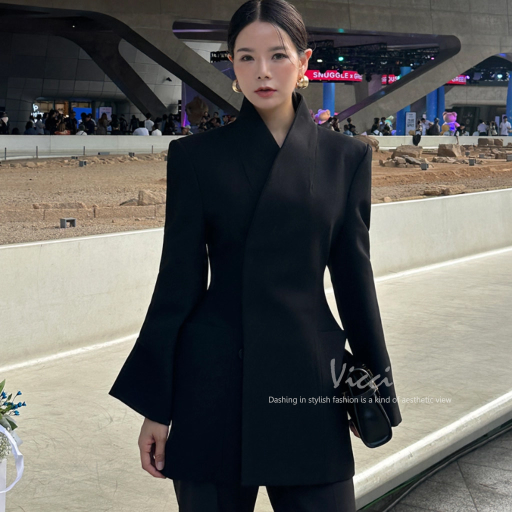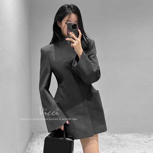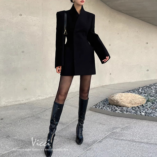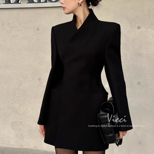 沙漏腰时尚 裙显瘦中长款 立领收腰黑色西装 西装 西服 修身 复古新中式