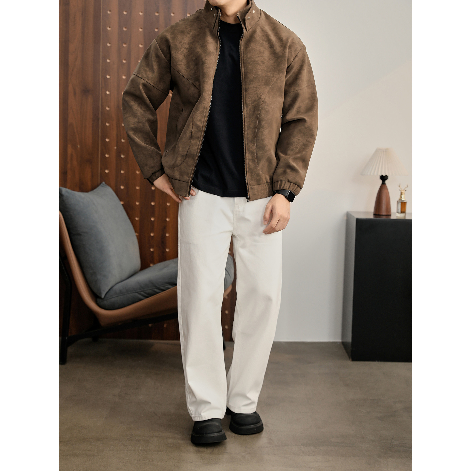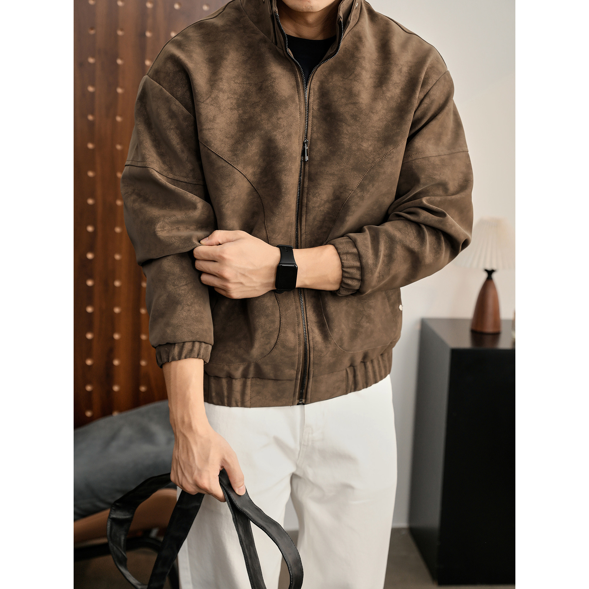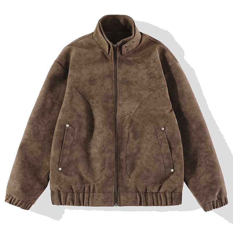 LUUD 保暖PU皮衣夹克男解构线立领外套 美拉德雾面树纹纹理感冬季