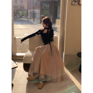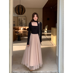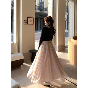 千金感撞色拼接收腰长袖 韩系高智法式 连衣裙 干枯玫瑰 Even一雯