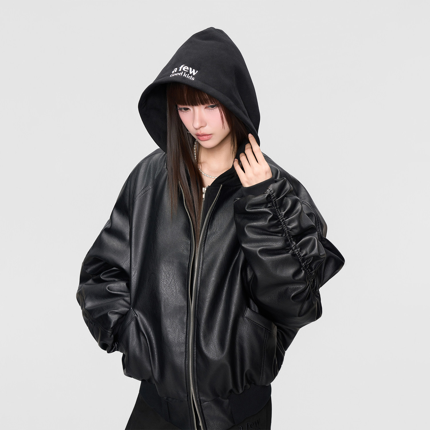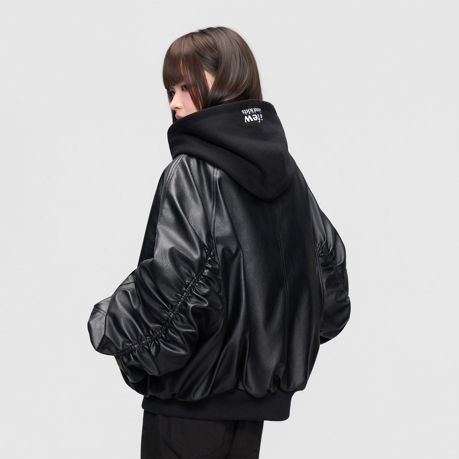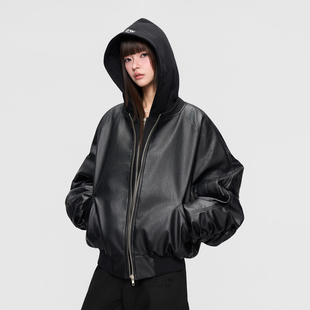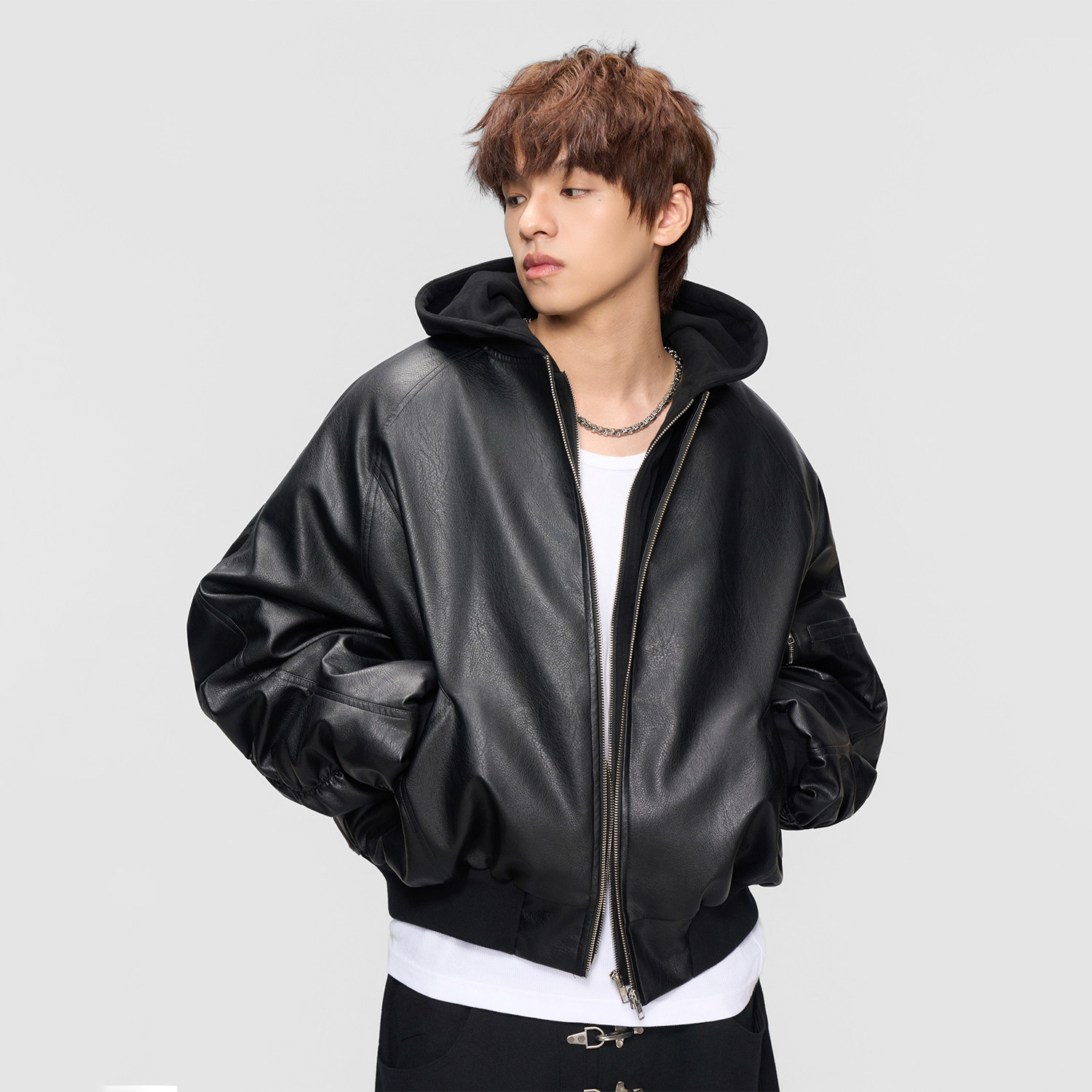 POPPROJECT皮衣bomber双层假两件连帽外套飞行员夹克皮质棉服ma1