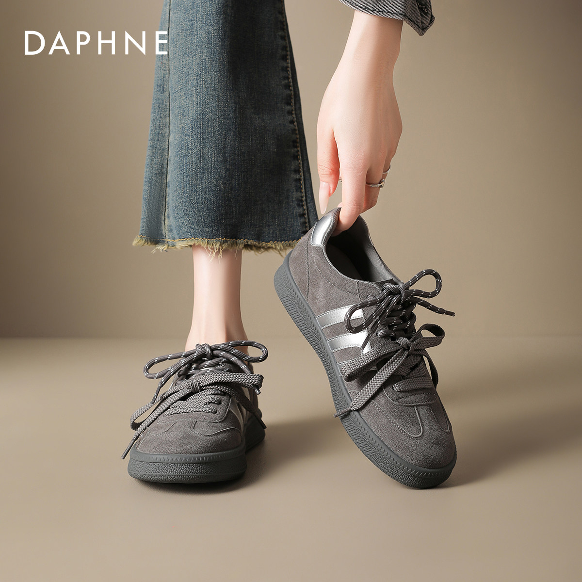 女板鞋 女鞋 2026春季 运动灰色厚底单鞋 子 新款 达芙妮平底休闲德训鞋