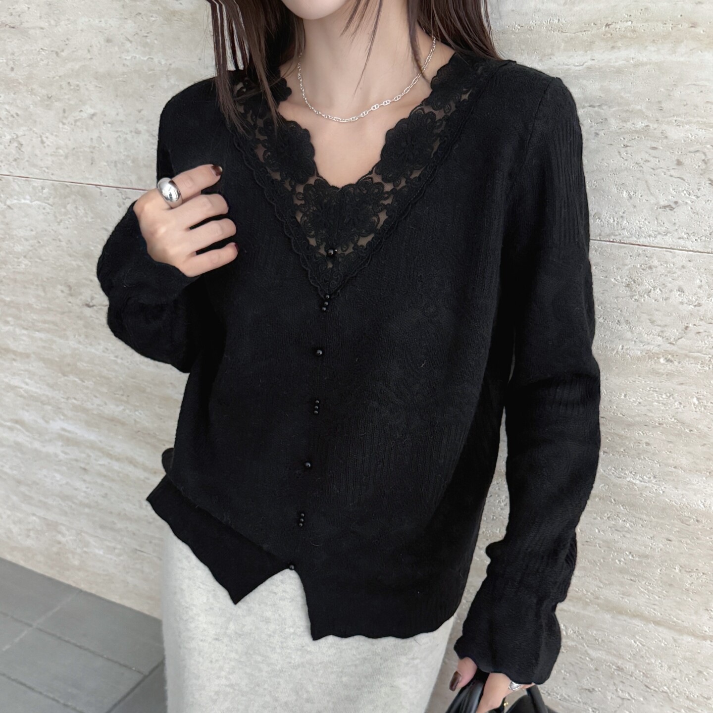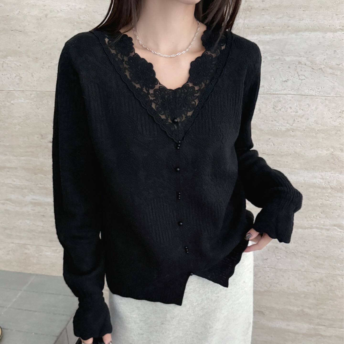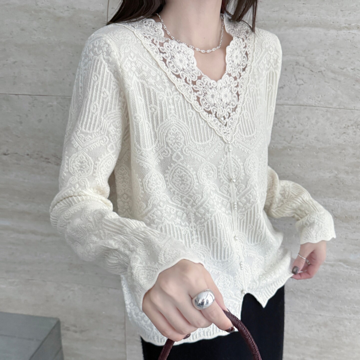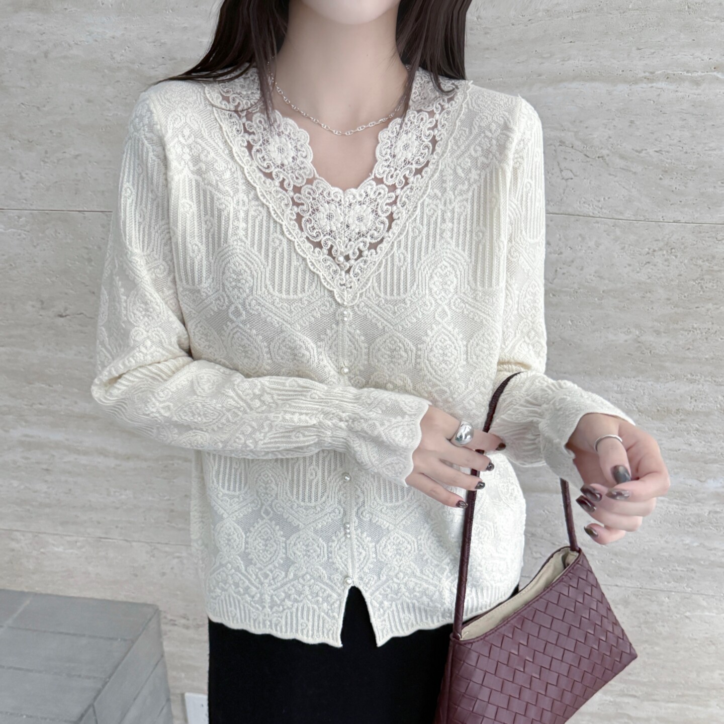 打底衫 新款 拼接V领针织衫 毛衣爆款 法式 女装 蕾丝花边羊毛轻奢春季